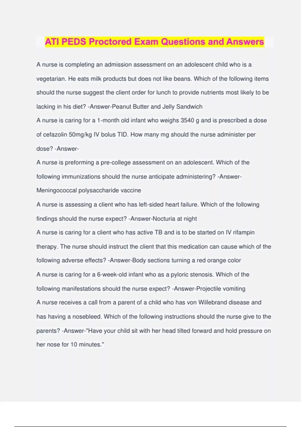 ATI PEDS Proctored Exam Questions and Answers A nurse is completing an admission assessment on an adolescent child who is a vegetarian. He eats milk products but does not like beans. Which of the following items should the nurse suggest the client order for lunch to provide nutrients most likely to be lacking in his diet? -Answer-Peanut Butter and Jelly Sandwich A nurse is caring for a 1-month old infant who weighs 3540 g and is prescribed a dose of cefazolin 50mg/kg IV bolus TID. How many mg should the nurse administer per dose? -Answer- A nurse is preforming a pre-college assessment on an adolescent. Which of the following immunizations should the nurse anticipate administering? -Answer- Meningococcal polysaccharide vaccine A nurse is assessing a client who has left-sided heart failure. Which of the following findings should the nurse expect? -Answer-Nocturia at night A nurse is caring for a client who has active TB and is to be started on IV rifampin therapy. The nurse should instruct the client that this medication can cause which of the following adverse effects? -Answer-Body sections turning a red orange color A nurse is caring for a 6-week-old infant who as a pyloric stenosis. Which of the following manifestations should the nurse expect? -Answer-Projectile vomiting A nurse receives a call from a parent of a child who has von Willebrand disease and has having a nosebleed. Which of the following instructions should the nurse give to the parents? -Answer-"Have your child sit with her head tilted forward and hold pressure on her nose for 10 minutes." A nurse is assessing a child who is in sickle cell crisis. Which of the following findings should the nurse expect? -Answer-Pain A nurse is providing preoperative teaching by demonstrating diaphragmatic breathing to a client who is scheduled for surgery in the morning. Which of the following actions should the nurse include in the demonstration? -Answer-Place her hands on the sides of her rib cage A nurse is assessing a 3-year-old child who has aortic stenosis. Which of the following findings should the nurse expect? (select all that apply). -Answer--Hypotension -Weak pulses -Murmur A nurse is planning care for a client who has idiopathic thrombocytopenic purpur (ITP). Which of the following manifestations is the most appropriate for the nurse to monitor? - Answer-Bleeding A nurse is providing teaching to a parent of a child who has Hirschsprung disease is scheduled for initial surgery. Which of the following statements indicates an understanding of the teaching? -Answer-I'm glad that my child's ostomy is only temporary A school nurse identifies that a child has pediculosis capitis and educates the child's parents about the condition. Which of the following statements by the parents indicated an understanding of the teaching? -Answer-All recently used clothing, bedding, and towels must be washed in hot water