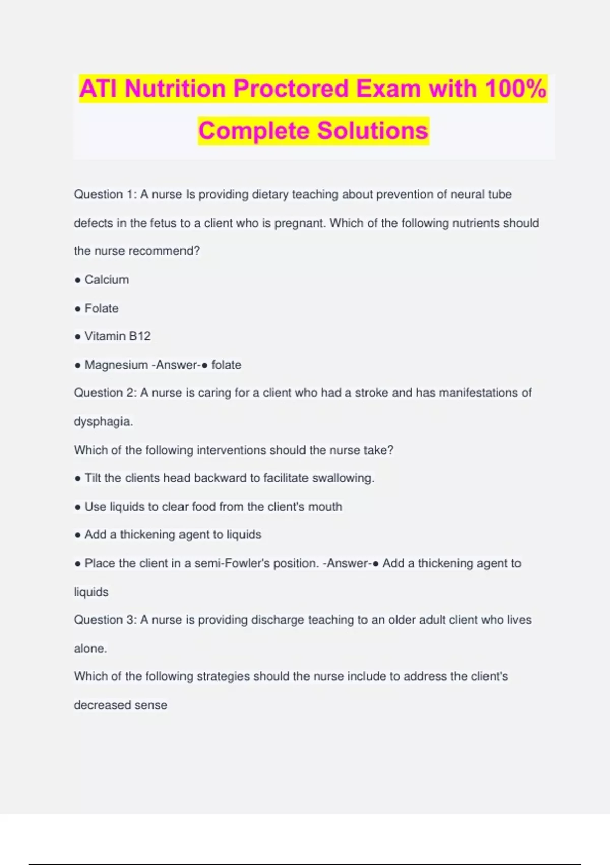 ATI PEDS Proctored Exam Questions and Answers 100% Correct A nurse is completing an admission assessment on an adolescent child who is a vegetarian. He eats milk products but does not like beans. Which of the following items should the nurse suggest the client order for lunch to provide nutrients most likely to be lacking in his diet? -Answer-Peanut Butter and Jelly Sandwich A nurse is caring for a 1-month old infant who weighs 3540 g and is prescribed a dose of cefazolin 50mg/kg IV bolus TID. How many mg should the nurse administer per dose? -Answer- A nurse is preforming a pre-college assessment on an adolescent. Which of the following immunizations should the nurse anticipate administering? -Answer- Meningococcal polysaccharide vaccine A nurse is assessing a client who has left-sided heart failure. Which of the following findings should the nurse expect? -Answer-Nocturia at night A nurse is caring for a client who has active TB and is to be started on IV rifampin therapy. The nurse should instruct the client that this medication can cause which of the following adverse effects? -Answer-Body sections turning a red orange color A nurse is caring for a 6-week-old infant who as a pyloric stenosis. Which of the following manifestations should the nurse expect? -Answer-Projectile vomiting A nurse receives a call from a parent of a child who has von Willebrand disease and has having a nosebleed. Which of the following instructions should the nurse give to the parents? -Answer-"Have your child sit with her head tilted forward and hold pressure on her nose for 10 minutes." A nurse is assessing a child who is in sickle cell crisis. Which of the following findings should the nurse expect? -Answer-Pain A nurse is providing preoperative teaching by demonstrating diaphragmatic breathing to a client who is scheduled for surgery in the morning. Which of the following actions should the nurse include in the demonstration? -Answer-Place her hands on the sides of her rib cage A nurse is assessing a 3-year-old child who has aortic stenosis. Which of the following findings should the nurse expect? (select all that apply). -Answer--Hypotension -Weak pulses -Murmur A nurse is planning care for a client who has idiopathic thrombocytopenic purpur (ITP). Which of the following manifestations is the most appropriate for the nurse to monitor? - Answer-Bleeding A nurse is providing teaching to a parent of a child who has Hirschsprung disease is scheduled for initial surgery. Which of the following statements indicates an understanding of the teaching? -Answer-I'm glad that my child's ostomy is only temporary A school nurse identifies that a child has pediculosis capitis and educates the child's parents about the condition. Which of the following statements by the parents indicated an understanding of the teaching? -Answer-All recently used clothing, bedding, and towels must be washed in hot water. A nurse is providing dietary teaching to the parents of a newborn who is being breastfed. The nurse should instruct that the transition to whole milk can occur at which of the following ages? -Answer-12 months A nurse is assessing a 6-month old patient at a well-child visit. Which of the following findings should the nurse expect? -Answer-Closed posterior fontanel A nurse is caring for a 2-year old child who has seizures and is receiving phenytoin in suspension form. Which of the following actions should the nurse take before administering each dose? -Answer-Shake the container vigorously. A nurse is planning care for a female client who has a T4 spinal cord injury and is at risk for acquiring urinary tract infections. Which of the following actions should the nurse include in the client's plan of care? -Answer-Obtain a order for an in and out catheter A nurse is planning care for a child who has suspected epiglottis. Which of the following actions should the nurse take? -Answer-Place the child on droplet precautions