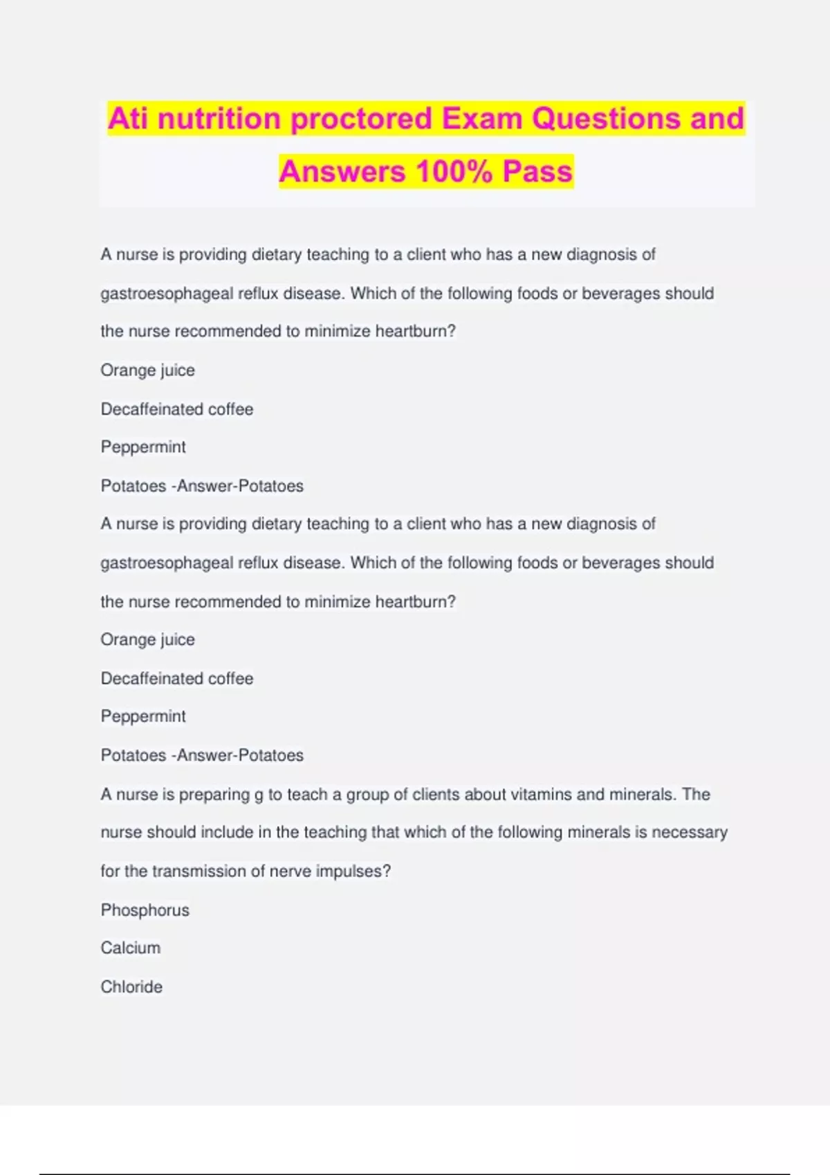 Ati nutrition proctored Exam Questions and Answers 100% Pass A nurse is providing dietary teaching to a client who has a new diagnosis of gastroesophageal reflux disease. Which of the following foods or beverages should the nurse recommended to minimize heartburn? Orange juice Decaffeinated coffee Peppermint Potatoes -Answer-Potatoes A nurse is providing dietary teaching to a client who has a new diagnosis of gastroesophageal reflux disease. Which of the following foods or beverages should the nurse recommended to minimize heartburn? Orange juice Decaffeinated coffee Peppermint Potatoes -Answer-Potatoes A nurse is preparing g to teach a group of clients about vitamins and minerals. The nurse should include in the teaching that which of the following minerals is necessary for the transmission of nerve impulses? Phosphorus Calcium Chloride Zinc -Answer-Calcium A nurse is preparing g to teach a group of clients about vitamins and minerals. The nurse should include in the teaching that which of the following minerals is necessary for the transmission of nerve impulses? Phosphorus Calcium Chloride Zinc -Answer-Calcium A nurse is caring for a client who has a body mass index (BMI) of 30. Four weeks after nutritional counseling, which of the following evaluation findings indicates the plan of care was followed? BMI of 25 Weight gain of 1.8kg BMI of 33 Weight loss of 2.7kg -Answer-Weight loss of 2.7kg A nurse is caring for a client who has a body mass index (BMI) of 30. Four weeks after nutritional counseling, which of the following evaluation findings indicates the plan of care was followed? BMI of 25 Weight gain of 1.8kg BMI of 33 Weight loss of 2.7kg -Answer-Weight loss of 2.7kg A nurse is caring for a client who follows the dietary laws of Orthodox Judaism. Which of the following meal choices should the nurse request for the client? Turkey and cheese sandwich Spaghetti with tomato sauce Pork chop and applesauce Scrambled eggs and bacon -Answer-Spaghetti with tomato sauce A nurse is caring for a client who follows the dietary laws of Orthodox Judaism. Which of the following meal choices should the nurse request for the client? Turkey and cheese sandwich Spaghetti with tomato sauce Pork chop and applesauce Scrambled eggs and bacon -Answer-Spaghetti with tomato sauce A nurse is a long-term care facility is developing strategies to promote increased food intake for an older adult client. Which of the following interventions should the nurse implement? Offer sugar substitutes to increase the client's appetite. Provide opportunities to eat three large meals per day. Provide entertainment while the client is eating. Offer finger foods at mealtime -Answer-Offer finger foods at mealtime. A nurse is a long-term care facility is developing strategies to promote increased food intake for an older adult client. Which of the following interventions should the nurse implement? Offer sugar substitutes to increase the client's appetite. Provide opportunities to eat three large meals per day. Provide entertainment while the client is eating. Offer finger foods at mealtime -Answer-Offer finger foods at mealtime. A nurse is caring for four clients. The nurse should plan to administer total parenteral nutrition for which of the following clients? A client who is postoperative following a laminectomy and is receiving IV PCA A client who has dysphagia and does not recognize his family A client who has COPD and is going home with oxygen A client who has colon cancer and will undergo a hemicolectomy -Answer-A client who has colon cancer and will undergo a hemicolectomy A nurse is caring for four clients. The nurse should plan to administer total parenteral nutrition for which of the following clients? A client who is postoperative following a laminectomy and is receiving IV PCA A client who has dysphagia and does not recognize his family A client who has COPD and is going home with oxygen A client who has colon cancer and will undergo a hemicolectomy -Answer-A client who has colon cancer and will undergo a hemicolectomy A nurse is performing a nutritional evaluation for a client who reports paresthesia of the hands and feet. The nurse should identify this manifestation as an indication of which of the following dietary deficiencies?