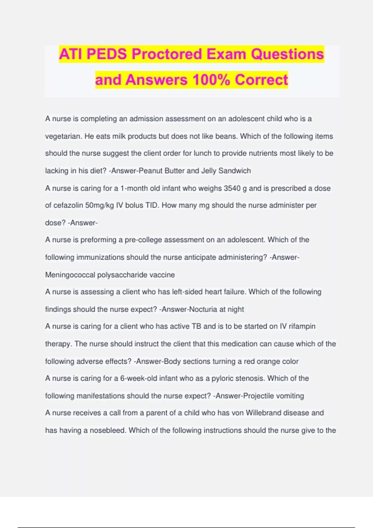 ATI Nutrition Proctored Exam with 100% Complete Solutions Question 1: A nurse Is providing dietary teaching about prevention of neural tube defects in the fetus to a client who is pregnant. Which of the following nutrients should the nurse recommend? ● Calcium ● Folate ● Vitamin B12 ● Magnesium -Answer-● folate Question 2: A nurse is caring for a client who had a stroke and has manifestations of dysphagia. Which of the following interventions should the nurse take? ● Tilt the clients head backward to facilitate swallowing. ● Use liquids to clear food from the client's mouth ● Add a thickening agent to liquids ● Place the client in a semi-Fowler's position. -Answer-● Add a thickening agent to liquids Question 3: A nurse is providing discharge teaching to an older adult client who lives alone. Which of the following strategies should the nurse include to address the client's decreased sense of taste and smell? ● Maintain consistent food textures at mealtimes. ● Use kosher salt in place of table salt. ● Label and date food in the refrigerator. ● Wait 1 hour after eating to consume fluids. -Answer-● Maintain consistent food textures at mealtimes Question 4: A nurse is teaching a client who has a goiter appropriate food choices related to dietary needs. Which of the following client statements indicates an understanding of the teaching? ● 'I will eat more tuna" ● "I will eat more red meat" ● "I will eat bananas for a snack" ● "I would eat blueberries every morning" -Answer-● 'I will eat more tuna" Question 5: A nurse is reviewing the laboratory findings of a client who has Clostridium difficile. Which of the following findings should indicate to the nurse that the client is experiencing fluid volume deficit? ● Potassium 3.5 mEq/L ● HCT 53% ● Sodium 145 mEq/L ● HbA1c 5% -Answer-● HCT 53% Question 6: A client in the oliguric phase of acute renal failure had a urinary output of 420 ml during the preceding 24-hour period. How much fluid should the nurse plan to provide the client over the next 24 hr? ● 2,550 ml ● 1,530 ml ● 920 ml ● 2,040 ml -Answer-● 920 ml Question 7: A nurse is teaching a client ways to manage anorexia while receiving radiation therapy. Which of the following instructions should the nurse include in the teaching? ● "Limit High-kilocalorie supplements to between meals." ● "Eat hot food rather than cold foods." ● "Avoid overeating during "good" days." ● "Consume nutrition-dense foods first." -Answer-● "Consume nutrition-dense foods first." Question 8: A nurse is teaching a client who is receiving bolus feeding through a nasogastric tube about dumping syndrome. The nurse should instruct