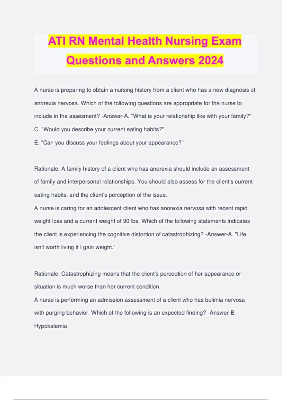 ATI RN Mental Health Nursing Exam Questions and Answers 2024 A nurse is preparing to obtain a nursing history from a client who has a new diagnosis of anorexia nervosa. Which of the following questions are appropriate for the nurse to include in the assesment? -Answer-A. "What is your relationship like with your family?" C. "Would you describe your current eating habits?" E. "Can you discuss your feelings about your appearance?" Rationale: A family history of a client who has anorexia should include an assessment of family and interpersonal relationships. You should also assess for the client's current eating habits, and the client's perception of the issue. A nurse is caring for an adolescent client who has anorexia nervosa with recent rapid weight loss and a current weight of 90 lbs. Which of the following statements indicates the client is experiencing the cognitive distortion of catastrophizing? -Answer-A. "Life isn't worth living if I gain weight." Rationale: Catastrophizing means that the client's perception of her appearance or situation is much worse than her current condition. A nurse is performing an admission assessment of a client who has bulimia nervosa with purging behavior. Which of the following is an expected finding? -Answer-B. Hypokalemia D. Slightly elevated body weight Rationale: A client who has a bulimia nervosa disorder will be hypokalemic, will maintain a weight within a normal range or slightly higher; they will not have a period (amenorrhea), and a patchy skin (mottling of skin). A nurse is caring for a client who has bulimia nervosa and who has stopped purging behavior. The client tells the nurse that she is afraid she is going to gain weight. Which of the following is an appropriate response by the nurse? -Answer-C. "I understand you have concerns about your weight, but first, let's talk about your recent accomplishments." Rationale: A nurse should focus on the patient's accomplishments, which helps promote self-esteem and self-image. A nurse on an acute care unit is planning care for a client who has anorexia nervosa with binge-eating and purging behavior. Which of the following nursing actions is appropriate to include in the client's plan of care? -Answer-D. Implement one-to-one observation during meal times. Rationale: A nurse should closely monitor the client during and after meals to prevent purging. It may necessitate accompanying the patient to the restroom. A patient should also have a highly structured milieu, including meal times. The client should not eat foods high in fat and gas-producing at the start of a treatment. A positive approach should also be used which includes rewards, such as when completing meals or consuming a set number of calories. A nurse is caring for a client who is on lithium therapy. The client states that he wants to take ibuprofen for osteoarthritis pain relief. Which of the following statements by the nurse is appropriate? A. "That is a good choice. Ibuprofen does not interact with lithium." B. "Regular aspirin would be a better choice than ibuprofen." C. "Lithium decreases the effectiveness of ibuprofen." D. "The ibuprofen will make your lithium level fall too low." -Answer-B A nurse is discussing routine follow-up needs for a client who has a new prescription for valproic acid (Depakote). The nurse should inform the client of the need for routine monitoring of which of the following? A. AST/ALT and LDH B. Creatinine and BUN C. WBC and granulocyte counts D. Serum sodium and potassium -Answer-A A nurse is discussing early indications of toxicity with a client who has a new prescription for lithium carbonate for bipolar disorder. The nurse should include which of the following in the teaching? (Select all that apply.) A. Constipation B. Polyuria C. Rash D. Muscle weakness E. Tinnitus -Answer-B, D A nurse is caring for a client who is experiencing extreme mania due to bipolar disorder. Prior to administration of lithium carbonate, the nurse notes that the lithium blood level is 1.2 mEq/L. Which of the following is an appropriate action by the nurse? A. Administer the next dose of lithium carbonate as scheduled. B. Prepare for administration of aminophylline. C. Notify the provider for a possible increase in the dosage of lithium carbonate. D. Request a stat repeat of the client's lithium blood level. -Answer-A A nurse is admitting a client who has a new diagnosis of bipolar disorder and is scheduled to begin lithium therapy. When collecting a medical history from the client's adult daughter, which of the following statements is the highest priority to report to the provider? A. "My mother has diabetes that is controlled by her diet." B. "My mother recently completed a course of prednisone for acute bronchitis." C. "My mother received her flu vaccine last month." D. "My mother is currently on furosemide for her congestive heart failure." -Answer-D A nurse is caring for a client who has schizophrenia and exhibits a lack of grooming and a flat affect. The nurse should anticipate a prescription of which of the following medications? A. Chlorpromazine (Thorazine) B. Thiothixene (Navane) C. Risperidone (Risperdal) D. Haloperidol (Haldol) -Answer-C A nurse is caring for a client who takes ziprasidone (Geodon). The client reports difficulty swallowing the oral medication and becomes extremely agitated with injectable administration. The nurse should contact the provider to discuss a change to which of the following medications? (Select all that apply.) A. Olanzapine (Zyprexa) B. Quetiapine (Seroquel) C. Aripiprazole (Abilify) D. Clozapine (Clozaril) E. Paliperidone (Invega) -Answer-C, D A charge nurse is discussing manifestations of schizophrenia with a newly licensed nurse. Which of the following should the charge nurse identify as being effectively treated by conventional antipsychotics? (Select all that apply.) A. Auditory hallucinations B. Withdrawal from social situations C. Delusions of grandeur D. Severe agitation E. Anhedon