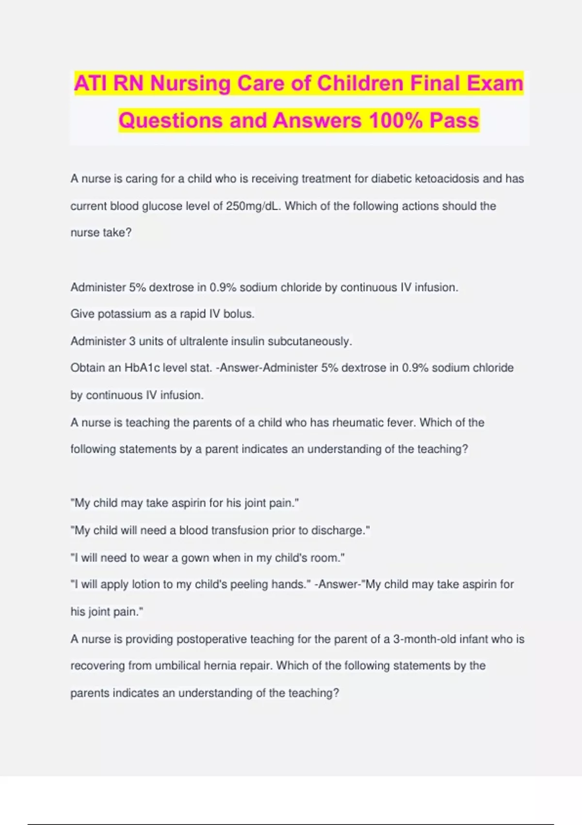 ATI RN Nursing Care of Children Final Exam Questions and Answers 100% Pass A nurse is caring for a child who is receiving treatment for diabetic ketoacidosis and has current blood glucose level of 250mg/dL. Which of the following actions should the nurse take? Administer 5% dextrose in 0.9% sodium chloride by continuous IV infusion. Give potassium as a rapid IV bolus. Administer 3 units of ultralente insulin subcutaneously. Obtain an HbA1c level stat. -Answer-Administer 5% dextrose in 0.9% sodium chloride by continuous IV infusion. A nurse is teaching the parents of a child who has rheumatic fever. Which of the following statements by a parent indicates an understanding of the teaching? "My child may take aspirin for his joint pain." "My child will need a blood transfusion prior to discharge." "I will need to wear a gown when in my child's room." "I will apply lotion to my child's peeling hands." -Answer-"My child may take aspirin for his joint pain." A nurse is providing postoperative teaching for the parent of a 3-month-old infant who is recovering from umbilical hernia repair. Which of the following statements by the parents indicates an understanding of the teaching? "I will expect the site to bulge when my baby cries." "I will place a belly band around my child's abdomen." "I will fold my baby's diaper away from the incision." "I will bathe my child in the bath tub daily." -Answer-"I will fold my baby's diaper away from the incision." A nurse is reviewing the medical record of a 2-month-old infant who has rotavirus. The nurse notes a hemoglobin level of 12g/dL and a hematocrit of 51%. Which of the following statements by the nurse indicates an understanding of the laboratory values? "The infant might be dehydrated." "The infant might be anemic." "The infant might have received too much fluid." "The infant might have leukemia." -Answer-"The infant might be dehydrated." A nurse is preparing to administer diphenhydramine 5mg/kg/day PO to divide equally every 8 hr to school-age child who weighs 50 Ib. Available is diphenhydramine oral solution 12.5 mg/5mL. How many mL should the nurse administer per dose? (Round the answer to the nearest whole number. Use a leading zero if it applies. Do not use a trailing zero.) -Answer-15 mL A nurse is caring for a toddler who has asthma. The parents are concerned about the toddler's reaction to the hospitalization. Which of the following actions should the nurse take to decrease the child's anxiety? Provide privacy. Give the child a thorough explanation before providing care. Encourage rooming-in. Tell the child you will help fix her. -Answer-Encourage rooming-in. A nurse is caring who has a vesicular rash. The parents of the child asks the nurse what illness can cause this rash for 6 days. The nurse should expert that the child has which of the following conditions? Measles Fifth disease Tetanus Varicella -Answer-Varicella A nurse is caring fora school-age child who has glomerulonephritis. The child has decreased urinary output, a blood pressure of 160/78 mm Hg, and is receiving hydralazine. Which of the following lunch choices should the nurse recommend? 1 hot dog, 22 potato chips, and 120 mL (4 oz) of orange juice 1 sandwich with lettuce, tomato, and 4 slices bacon, a small apple, and 240 mL (8 oz) of milk 3 oz grilled chicken, 1 cup of pear slices, and 120 mL (4 oz) of apple juice 1 cup of cottage cheese, a small banana, and 240 mL (8 oz) of soda -Answer-3 oz grilled chicken, 1 cup of pear slices, and 120 mL (4 oz) of apple juice