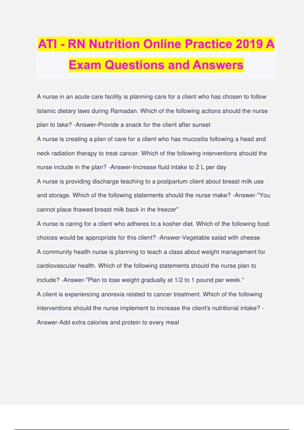 ATI - RN Nutrition Online Practice 2019 A Exam Questions and Answers A nurse in an acute care facility is planning care for a client who has chosen to follow Islamic dietary laws during Ramadan. Which of the following actions should the nurse plan to take? -Answer-Provide a snack for the client after sunset A nurse is creating a plan of care for a client who has mucositis following a head and neck radiation therapy to treat cancer. Which of the following interventions should the nurse include in the plan? -Answer-Increase fluid intake to 2 L per day A nurse is providing discharge teaching to a postpartum client about breast milk use and storage. Which of the following statements should the nurse make? -Answer-"You cannot place thawed breast milk back in the freezer" A nurse is caring for a client who adheres to a kosher diet. Which of the following food choices would be appropriate for this client? -Answer-Vegetable salad with cheese A community health nurse is planning to teach a class about weight management for cardiovascular health. Which of the following statements should the nurse plan to include? -Answer-"Plan to lose weight gradually at 1/2 to 1 pound per week." A client is experiencing anorexia related to cancer treatment. Which of the following interventions should the nurse implement to increase the client's nutritional intake? - Answer-Add extra calories and protein to every meal A nurse is teaching about nutritional requirements for a client who is starting a vegetarian diet. Which of the following information should the nurse include in the teaching? -Answer-Include two servings per day of nuts when on a vegetarian diet A nurse is teaching a female client about a healthy diet to control hypertension. Which of the following client statements indicates an understanding of the teaching? -Answer-"I will eat four servings of unsalted nuts per week." A nurse is caring for a client who is dehydrated and is receiving intermittent enteral feeding. Which of the following actions should the nurse plan to take? -Answer-Provide the formula as a continuous infusion A nurse is providing teaching to a client who has dumping syndrome and is experiencing weight loss. Which of the following instructions should the nurse include in the teaching? -Answer-Consume liquids between meals A nurse is providing dietary instructions for a client who has a prescription for warfarin. Which of the following foods should the nurse recommend the client eat in moderation while taking this medication? -Answer-Leafy green vegetables A nurse is teaching a client who has hypertension about decreasing sodium intake. Which of the following information should the nurse include in the teaching? -Answer- Season foods with herbs and spices A nurse is teaching a prenatal education class about breastfeeding. Which of the following instructions should the nurse include in the teaching? -Answer-Plan 5-min feedings on each breast on the first day after birth. A nurse is assessing a client who has type 2 diabetes mellitus. The nurse should recognize which of the following as a manifestation of hypoglycemia? -Answer- Confusion A nurse is teaching a client who is newly diagnosed with type 1 diabetes mellitus how to count carbohydrates. Which of the following statements made by the client indicates an understanding of the teaching? -Answer-"I know the serving size can affect the number of carbohydrates I eat." A nurse is assessing a client who is suspected of having lactose intolerance. Which of the following is an expected finding? -Answer-Flatulence A nurse is performing a cultural nursing assessment for a client whose religious practices include fasting 1 day each week. Which of the following questions should the nurse ask the client? (Select all that apply.) -Answer-"Are you exempt from fasting during illness?" "Does fasting mean refraining from drinking liquids?" "Does your fasting occur during certain hours of the day?