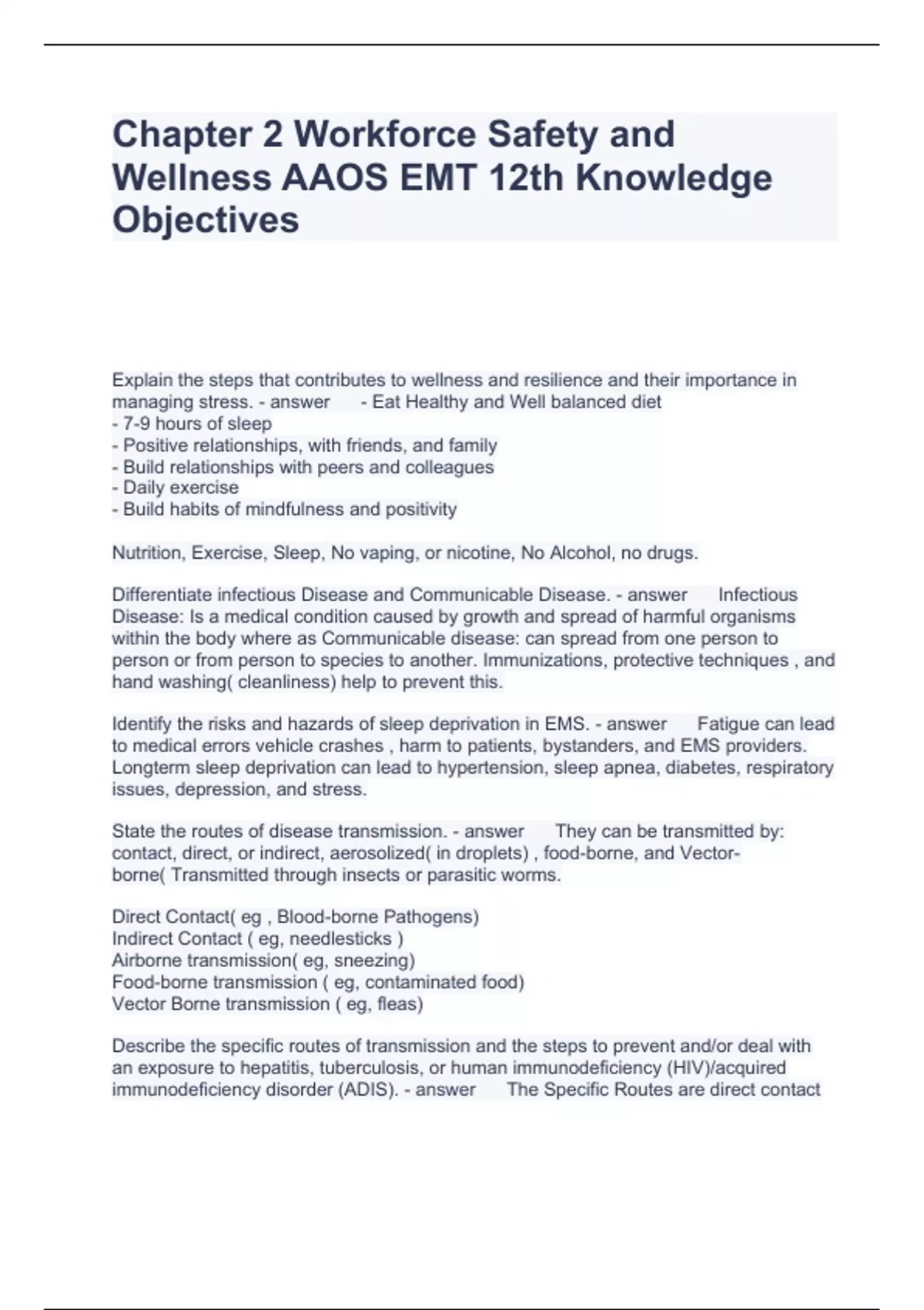 Chapter 2 Workforce Safety and Wellness AAOS EMT 12th Knowledge Objectives Questions with correct Answers 2024