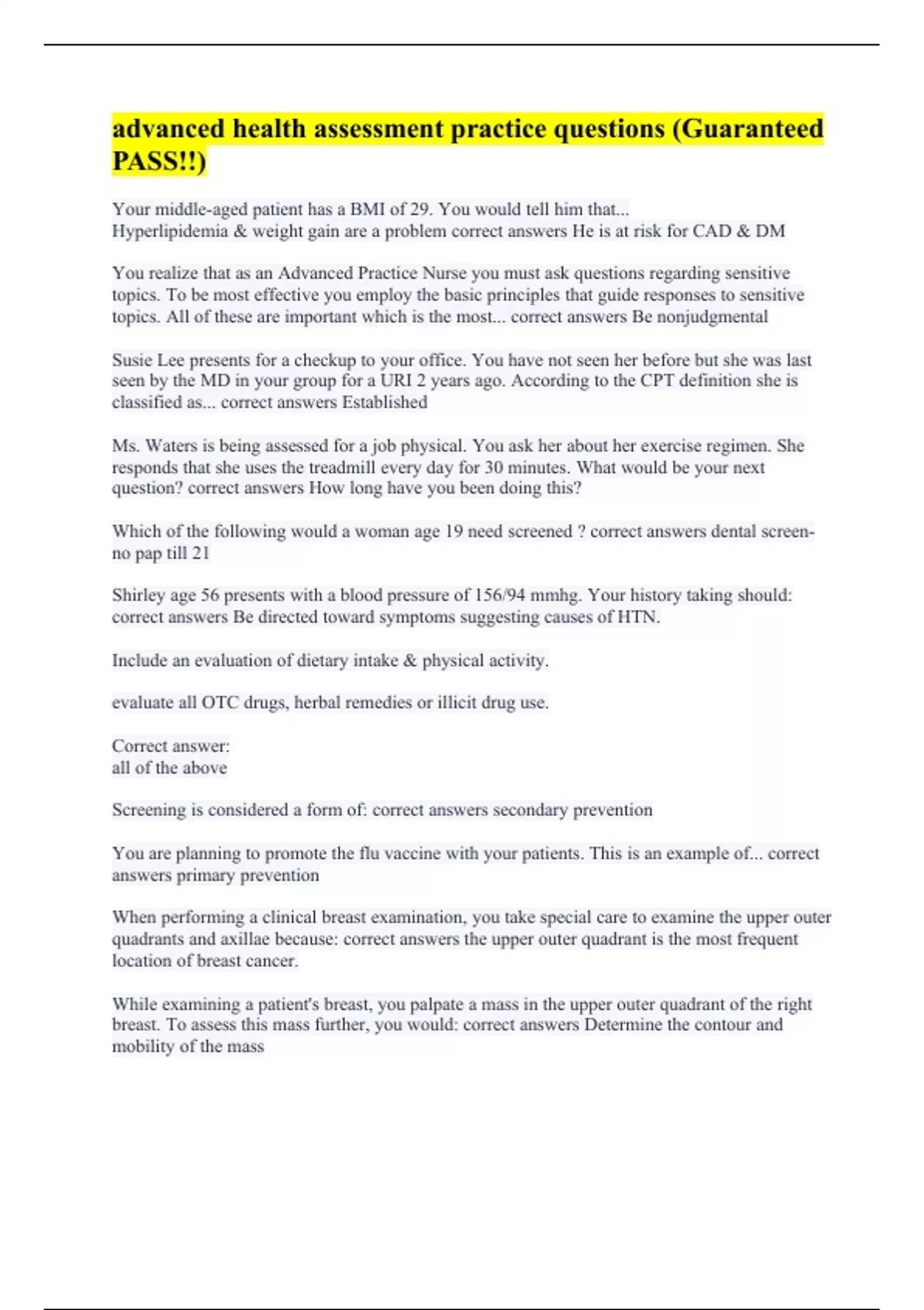 advanced health assessment practice questions (Guaranteed PASS!!)