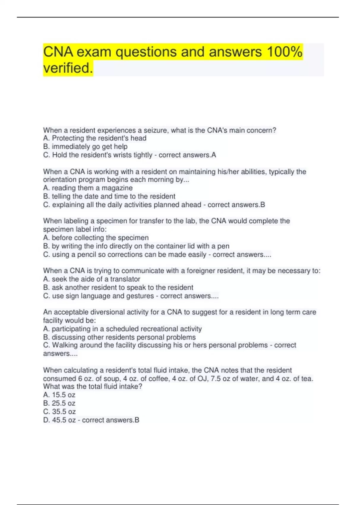 CNA exam questions and answers 100% verified. When a resident experiences a seizure, what is the CNA's main concern? A. Protecting the resident's head B. immediately go get help C. Hold the resident's wrists tightly - correct answers.A When a CNA is working with a resident on maintaining his/her abilities, typically the orientation program begins each morning by... A. reading them a magazine B. telling the date and time to the resident C. explaining all the daily activities planned ahead - correct answers.B When labeling a specimen for transfer to the lab, the CNA would complete the specimen label info: A. before collecting the specimen B. by writing the info directly on the container lid with a pen C. using a pencil so corrections can be made easily - correct answers.... When a CNA is trying to communicate with a foreigner resident, it may be necessary to: A. seek the aide of a translator B. ask another resident to speak to the resident C. use sign language and gestures - correct answers.... An acceptable diversional activity for a CNA to suggest for a resident in long term care facility would be: A. participating in a scheduled recreational activity B. discussing other residents personal problems C. Walking around the facility discussing his or hers personal problems - correct answers.... When calculating a resident's total fluid intake, the CNA notes that the resident consumed 6 oz. of soup, 4 oz. of coffee, 4 oz. of OJ, 7.5 oz of water, and 4 oz. of tea. What was the total fluid intake? A. 15.5 oz B. 25.5 oz C. 35.5 oz D. 45.5 oz - correct answers.B While providing care for the resident, a visitor makes the CNA angry. The CNA should: A. leave the resident's room immediately B. Glare at the visitor but say nothing C. Maintain composure, reply politely, and complete task - correct answers.C When a CNA is measuring a resident's respiration, the CNA should observe the resident for: A. 30 seconds B. 45 seconds C. 90 seconds D. 120 seconds - correct answers.... When the CNA addressed the resident, the name that the CNA should us is determined by: A. resident B. RNA C. family member - correct answers.A When should the CNA trim a resident's fingernails? A. AM care B. After soaking the resident hands C. After eating lunch - correct answers.B If a resident indicates to the CNA that they wish to speak with a minister, the CNA should: A. tell the resident the request will be given to the supervisor immediately B. make a mental note and tell the supervisor later C. make a quick call to the local minister and tell them to come immediately - correct answers.A What position has the nurse assistant put the resident when he/she placed in a side-lying position with a pillow under the head and shoulders and a pillow supporting the upper leg and thigh? A. Prone B. Fowler C. Lateral - correct answers.C Where in a resident's home would be the best place to put the emergency numbers? A. on a clip board B.in the drawer of the bedside table C. next to all the phones in the residence - correct answers.C Which of the following would be a way for a CNA to help a resident to exercise his/her citizenship right to be informed and involved? A. Encourage the resident to rest as much as possible to conserve energy