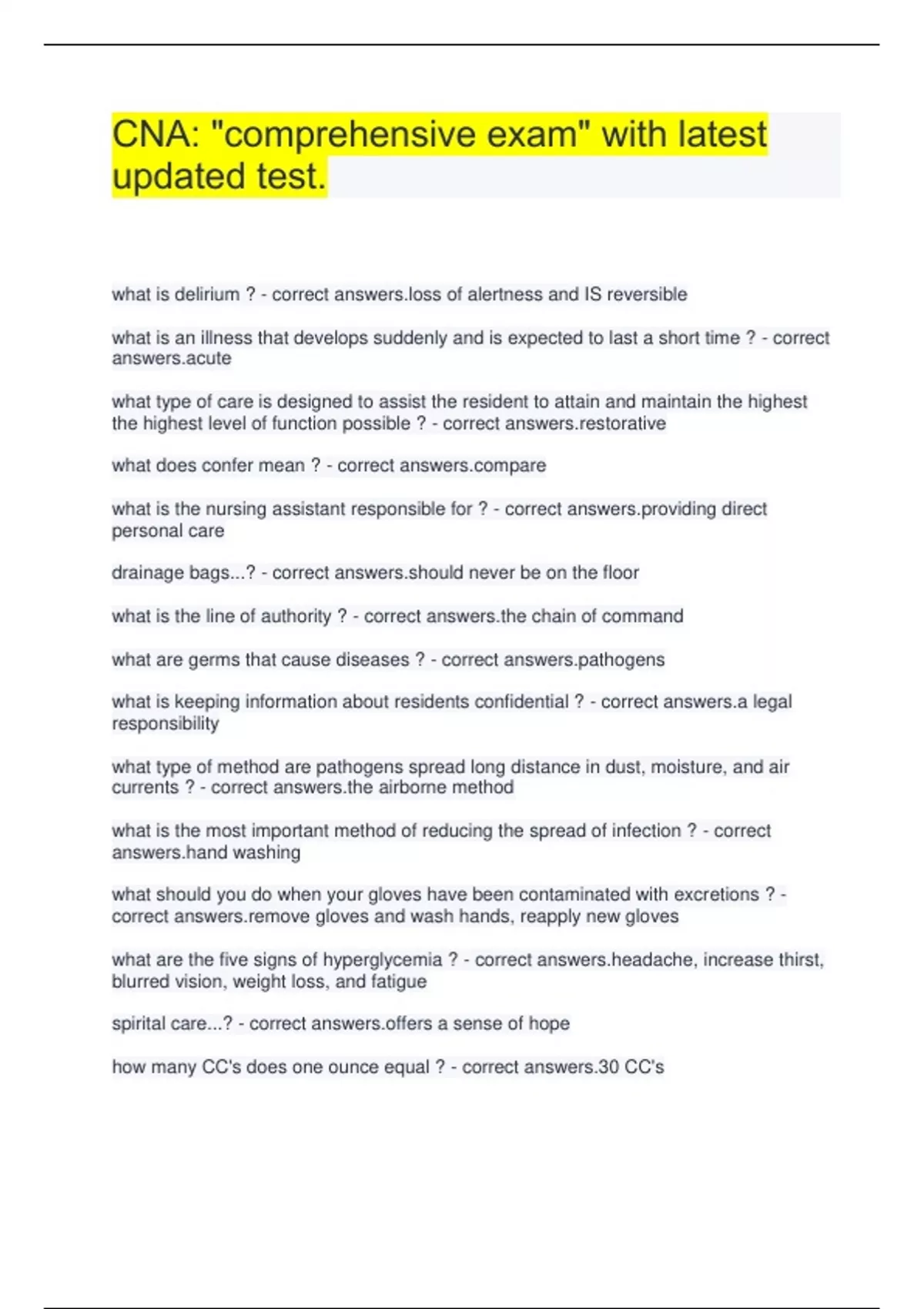 CNA: "comprehensive exam" with latest updated test. what is delirium ? - correct of alertness and IS reversible what is an illness that develops suddenly and is expected to last a short time ? - correct what type of care is designed to assist the resident to attain and maintain the highest the highest level of function possible ? - correct rative what does confer mean ? - correct re what is the nursing assistant responsible for ? - correct ding direct personal care drainage bags...? - correct d never be on the floor what is the line of authority ? - correct chain of command what are germs that cause diseases ? - correct gens what is keeping information about residents confidential ? - correct answers.a legal responsibility what type of method are pathogens spread long distance in dust, moisture, and air currents ? - correct airborne method what is the most important method of reducing the spread of infection ? - correct washing what should you do when your gloves have been contaminated with excretions ? - correct e gloves and wash hands, reapply new gloves what are the five signs of hyperglycemia ? - correct che, increase thirst, blurred vision, weight loss, and fatigue