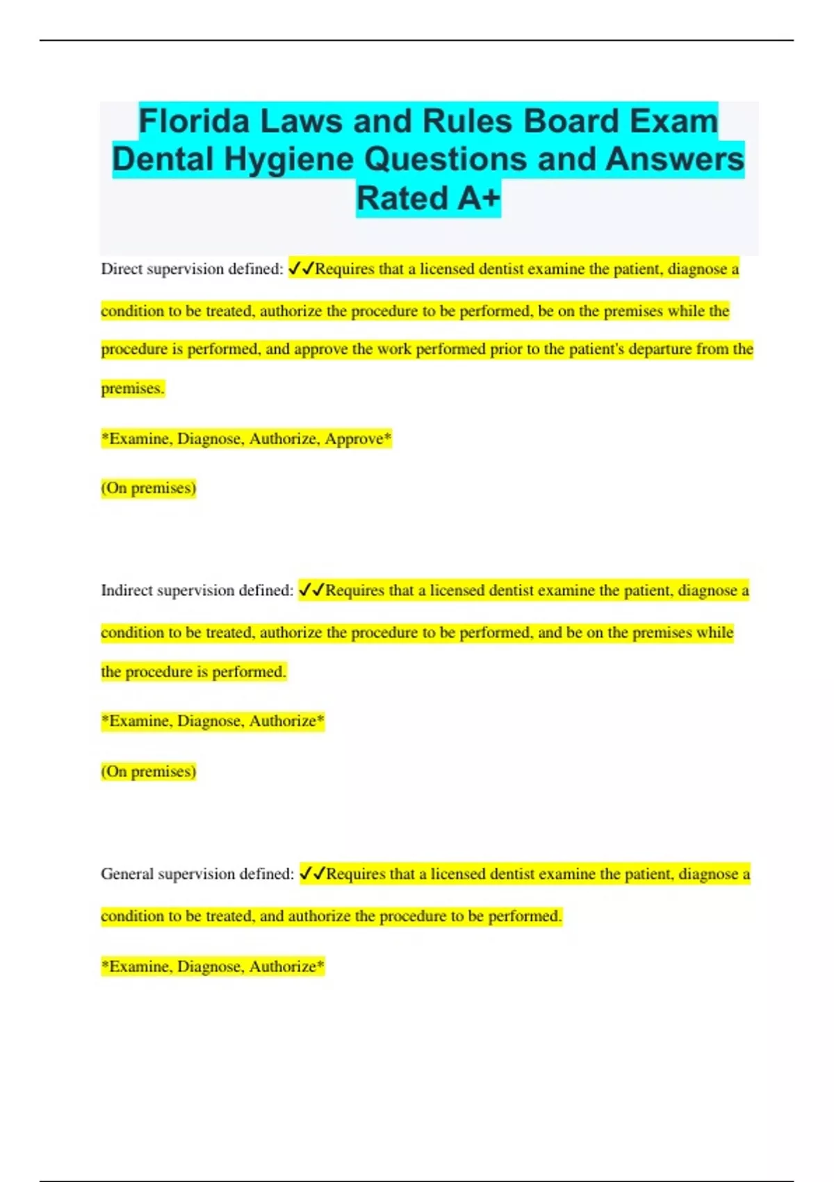 Florida Laws and Rules Board Exam Dental Hygiene Questions and Answers Rated A+