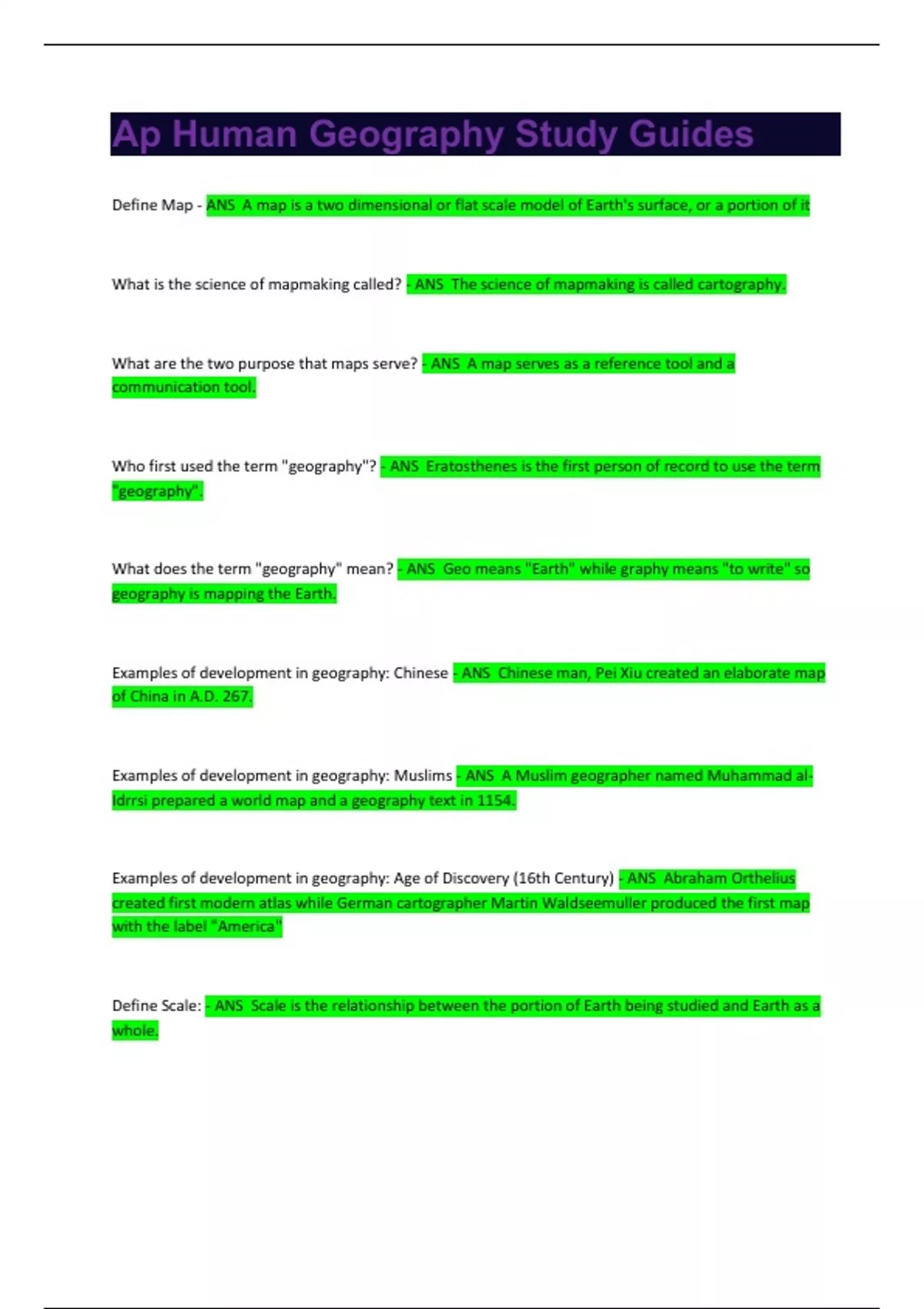 Define Map - ANS A map is a two dimensional or flat scale model of Earth's surface, or a portion of it What is the science of mapmaking called? - ANS The science of mapmaking is called cartography. What are the two purpose that maps serve? - ANS A map serves as a reference tool and a communication tool. Who first used the term "geography"? - ANS Eratosthenes is the first person of record to use the term "geography". What does the term "geography" mean? - ANS Geo means "Earth" while graphy means "to write" so geography is mapping the Earth. Examples of development in geography: Chinese - ANS Chinese man, Pei Xiu created an elaborate map of China in A.D. 267. Examples of development in geography: Muslims - ANS A Muslim geographer named Muhammad al- Idrrsi prepared a world map and a geography text in 1154. Examples of development in geography: Age of Discovery (16th Century) - ANS Abraham Orthelius created first modern atlas while German cartographer Martin Waldseemuller produced the first map with the label "America" Define Scale: - ANS Scale is the relationship between the portion of Earth being studied and Earth as a whole. What is the advantage of a map which shows only a small portion of the Earth's surface -like a neighborhood- that is, a large- scale map? - ANS The advantage is it would provide details about that particular place. The advantage does a map which shows the entire globe, a small-scale map, have? - ANS An entire globe map can effectively communicate processes and trends that affect everyone. List the four things that typically become distorted in various projections and explain the distortion. - ANS 1. The shape of the area can be distorted by appearing more elongated or squat than in reality. 2. The distance between two points may become increased or decreased. 3. The relative size of an area may be altered, so the one area may appear larger than another on a map but is in reality smaller. 4. The direction from one place to another can be distorted. Advantages and Disadvantages of the Mercator and Robinson. - ANS Advantages of Mercator: shape is distorted very little, direction is consistent , map is rectangular Disadvantages of Mercator: relative size is grossly distorted toward the poles, making high altitude places look larger Advantages for Robinson: useful for displaying information across the oceans Disadvantages for Robinson: land areas are much smaller than on other maps What place is designated as 0 degrees longitude? - ANS The Royal Observatory at Greenwich, England is 0 degrees longitude. What is that name for the line drawn at 0 degrees longitude? - ANS The name for the line at 0 degrees longitude is Prime Meridian.