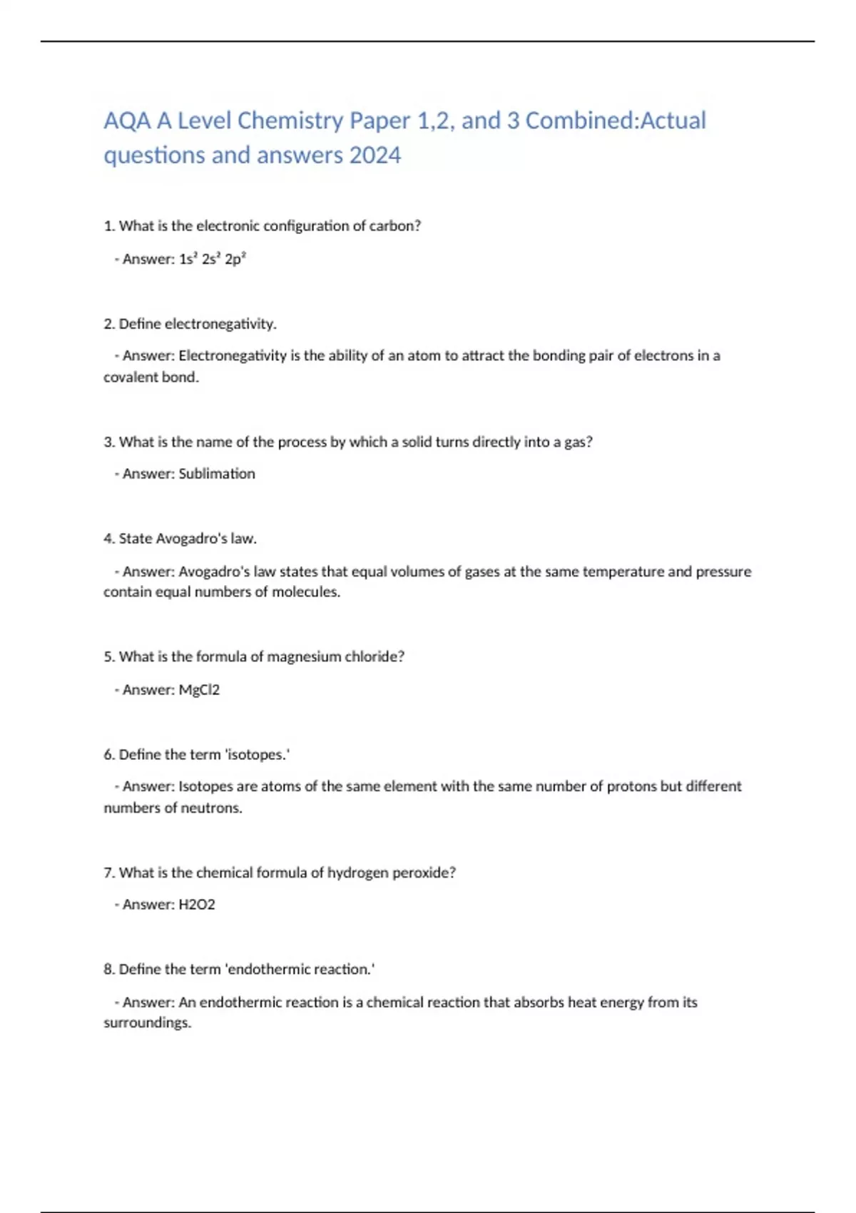 AQA A Level Chemistry Paper 1,2, and 3 Combined:Actual questions and answers 2024
