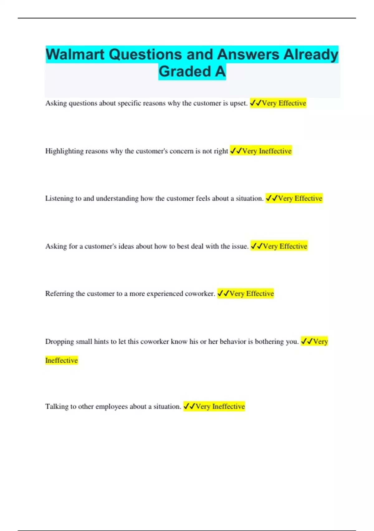 Walmart Questions and Answers Already Graded A Asking questions about specific reasons why the customer is upset. Very Effective Highlighting reasons why the customer's concern is not right Very Ineffective Listening to and understanding how the customer feels about a situation. Very Effective Asking for a customer's ideas about how to best deal with the issue. Very Effective Referring the customer to a more experienced coworker. Very Effective Dropping small hints to let this coworker know his or her behavior is bothering you. Very Ineffective Talking to other employees about a situation. Very Ineffective Speaking to your supervisor about a coworker's attitude at work. Very Effective Asking your supervisor to schedule you to work with somebody else. Very Ineffective Letting a coworker know that you are bothered by his or her behavior. Very Effective Trying to find out the root causes of the coworker's bothersome behavior. Very Effective If I were to leave my job, I would wait until the company found a replacement for me. Strongly Agree If I didn't do my job well, I wouldn't feel good about myself. Strongly Agree I often doubt the usefulness of what I am being taught. Strongly Disagree I utilize feedback to develop my skills. Strongly Agree Five mistakes for every 100 customers served is an acceptable number of mistakes. Strongly Disagree I have stolen money from work. Strongly Disagree I know the answers to many questions. Strongly Agree I participate in many activities that stimulate my intellectual curiosity. Strongly Agree It doesn't take me long to know whether a job is worth keeping. Strongly Disagree. I almost never become bored with the work i do. Strongly Agree I tend to be less accident prone than most people Strongly Agree I believe feedback is essential for improving performance. Strongly Agree I have difficulty understanding abstract ideas. Strongly Disagree Many things i see at work tend to cause more problems than they solve. Strongly Disagree Nothing is wrong with taking home supplies from work now and then. Strongly Disagree I find that feedback is key for reaching my work or school goals Strongly Agree When you're getting paid for the number of customers you serve, it doesn't make sense to spend a lot of extra time worrying about quality. Strongly Disagree I frequently change the way i approach job activities Strongly Disagree I believe feedback does little to improve performance. Strongly Disagree No one is the victim when you steal from your company Strongly Disagree I become frustrated with jobs when they no longer interest me. Strongly Disagree I feel required to make changes based on feedback. Strongly Agree I ask questions that nobody else does to learn why something occurred. Strongly Agree If I'm unhappy with a job, the best thing for me to do is to quit as soon as possible. Strongly Disagree I believe that I have the ability to deal with feedback effectively. Strongly Agree I enjoy spending time to find answers to difficult questions. Strongly Agree Receiving both positive and negative feedback is important to me. Strongly Agree What is good for the organization is the concern of the supervisors, not employees. Strongly Disagree My behaviors often are not as safe as they could be. Strongly Disagree Supervisory responsibilities tend to bring out a person's negative side. Strongly Disagree I would make sure I could quit a job before i was fired. Strongly Disagree I feel it is my responsibility to apply feedback to improve my performance. Strongly Agree I have taken merchandise from work. Strongly Disagree My pay is more important to me than the contributions I make to the company. Strongly Disagree