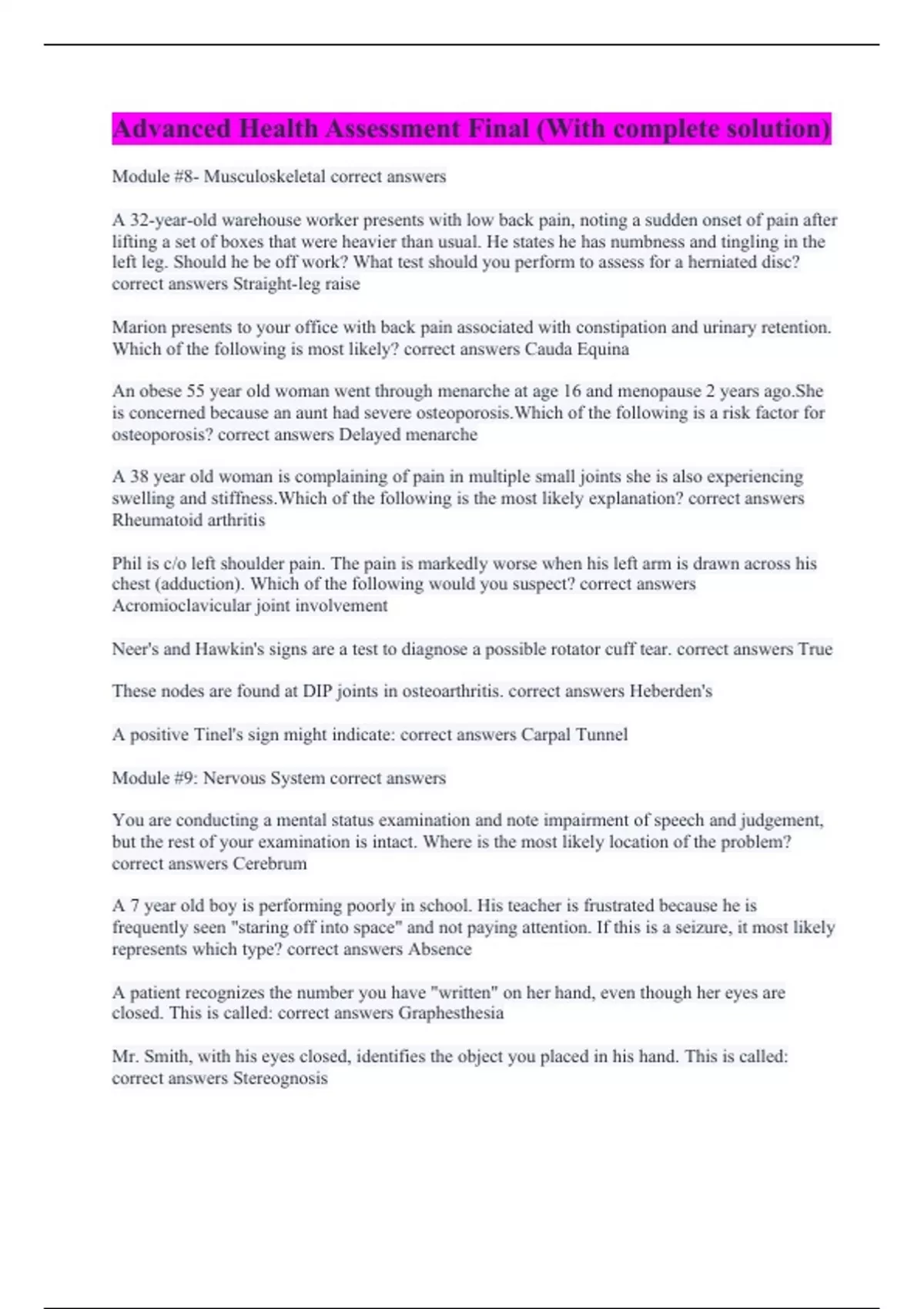 Advanced Health Assessment Final (With complete solution)