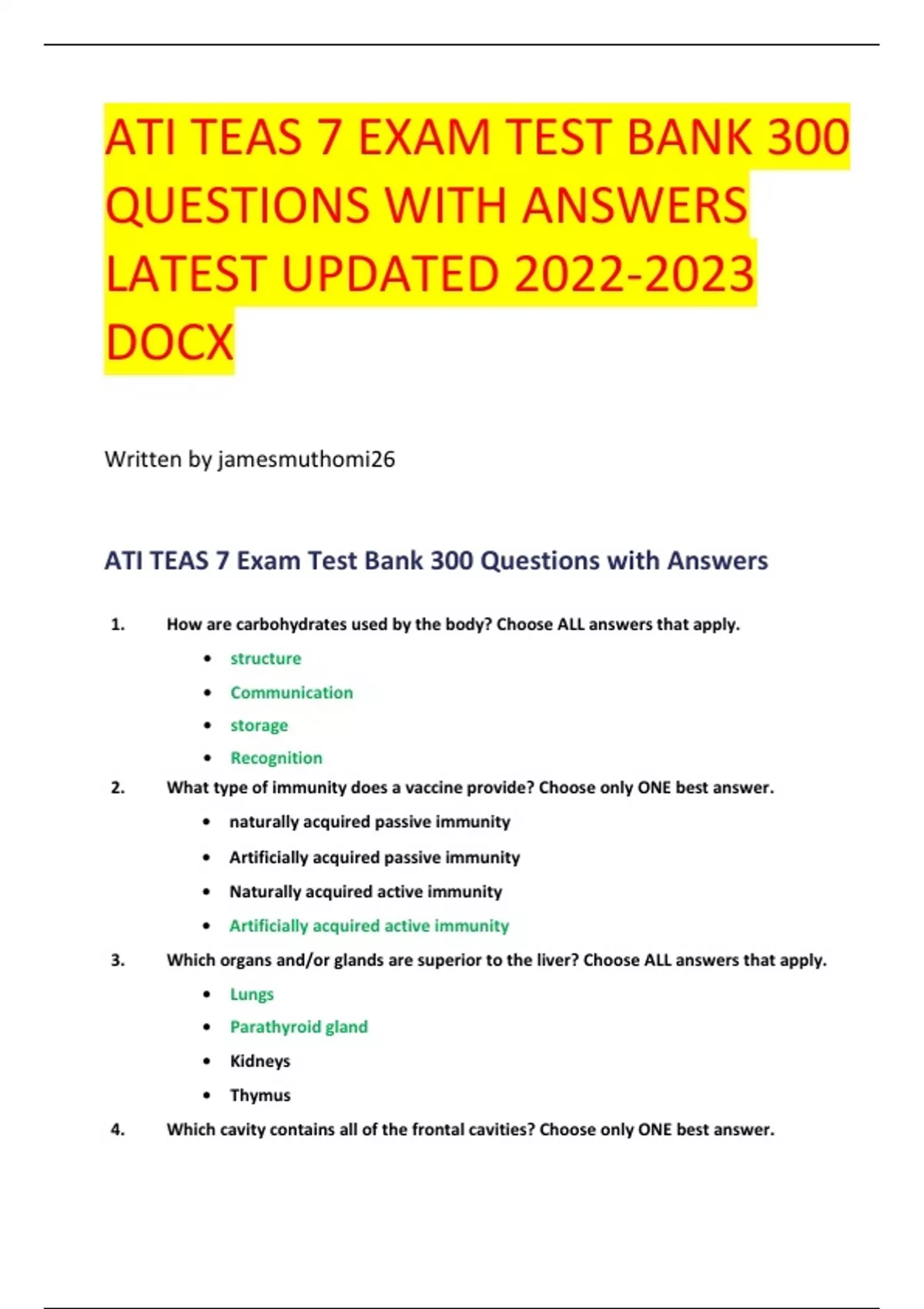 ATI TEAS 7 EXAM TEST BANK 300 QUESTIONS WITH ANSWERS LATEST UPDATED DOCX Written by jamesmuthomi26 ATI TEAS 7 Exam Test Bank 300 Questions with Answers 1. How are carbohydrates used by the body? Choose ALL answers that apply. • structure • Communication • storage • Recognition 2. What type of immunity does a vaccine provide? Choose only ONE best answer. • naturally acquired passive immunity • Artificially acquired passive immunity • Naturally acquired active immunity • Artificially acquired active immunity 3. Which organs and/or glands are superior to the liver? Choose ALL answers that apply. • Lungs • Parathyroid gland • Kidneys • Thymus 4. Which cavity contains all of the frontal cavities? Choose only ONE best answer. Med C • Dorsal • Thoracic • Abdominopelvic • Ventral 5. Which of the following carry oxygenated blood? Choose ALL answers that apply. • Pulmonary artery • Pulmonary vein • Aorta • Superior vena cava 6. Which of the following are disaccharides? Choose ALL answers that apply. • Sucrose • Glucose • Cellulose • Lactose 7. Which body system is responsible for the transport of dissolved oxygen from the lungs tothe spleen? • Immune • Endocrine • Respiratory • Cardiovascular 8. Which condition can lead to blood clots and stroke? ATI TEAS 7 EXAM TEST BANK 300 QUESTIONS WITH ANSWERS LATEST UPDATED DOCX Written by jamesmuthomi26 • Aneurysm • Arrhythmia • Asthma • Hypertension 9. A botanist wants to determine if environmental temperature affects root growth. In her experiment, she creates 4 rooms at temperatures that vary by 5 degrees F. Each room gets20 seedlings of the same species, which she grows on agar plates for 60 days. Once a day,she measures the length of each seedling's root. At the end of 60 days, she compares the length of the roots with the room temperature. She finds the room with the lowest temperature produced the longest roots. What is the independent variable in this study? • Temperature • Seedlings • Light • Root length 10. Which of the following can act as enzymes in the body? • Globular proteins Med C • Lipase • Amylase • Glucagon 11. Which of the following is the carbohydrate monomer? • Disaccharide • Lactose • Monosaccharide • Thymine 12. Which of the following are true about water? • Water has polar covalent bonds. • Water has a neutral pH of 7. • Water has a low specific heat capacity. • Water as a solid is less dense than water as a liquid.