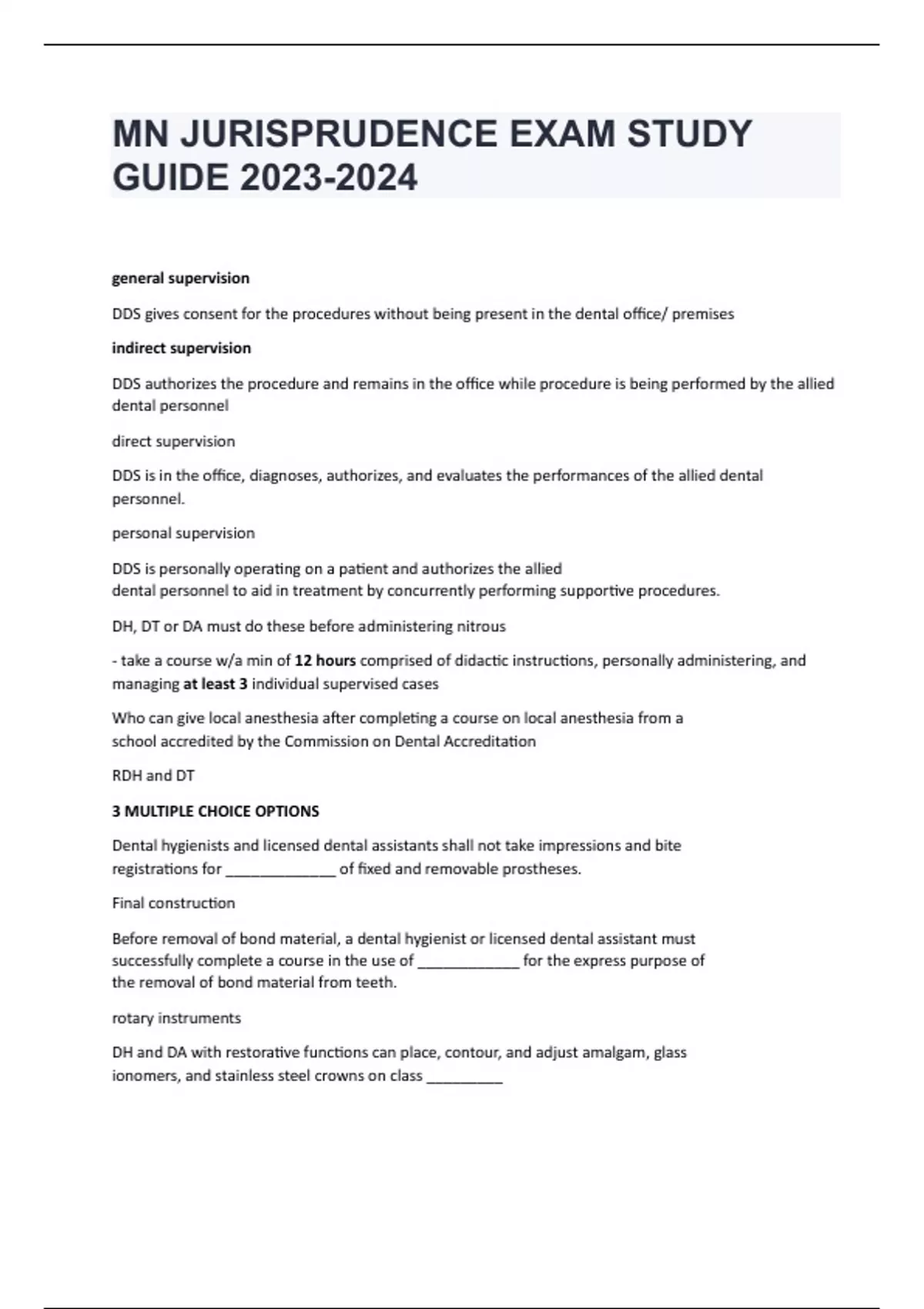 general supervision DDS gives consent for the procedures without being present in the dental office/ premises indirect supervision DDS authorizes the procedure and remains in the office while procedure is being performed by the allied dental personnel direct supervision DDS is in the office, diagnoses, authorizes, and evaluates the performances of the allied dental personnel. personal supervision DDS is personally operating on a patient and authorizes the allied dental personnel to aid in treatment by concurrently performing supportive procedures. DH, DT or DA must do these before administering nitrous - take a course w/a min of 12 hours comprised of didactic instructions, personally administering, and managing at least 3 individual supervised cases Who can give local anesthesia after completing a course on local anesthesia from a school accredited by the Commission on Dental Accreditation RDH and DT 3 MULTIPLE CHOICE OPTIONS Dental hygienists and licensed dental assistants shall not take impressions and bite registrations for _____________ of fixed and removable prostheses. Final construction Before removal of bond material, a dental hygienist or licensed dental assistant must successfully complete a course in the use of ____________ for the express purpose of the removal of bond material from teeth. rotary instruments DH and DA with restorative functions can place, contour, and adjust amalgam, glass ionomers, and stainless steel crowns on class _________ (RDH and DA must complete a board approved course on these specific restorative procedures) Class I, II, V 3 MULTIPLE CHOICE OPTIONS who can administer local anesthesia? RDH under general supervision 3 MULTIPLE CHOICE OPTIONS who can monitor a patient on nitrous? RDH under general supervision LDA under indirect supervisoin 3 MULTIPLE CHOICE OPTIONS T/F -- DH or LDA shall NOT take impressions and bite registrations for the FINAL construction of fixed and removable prostheses. true 1 MULTIPLE CHOICE OPTION who can utilizing rotary instruments for the removal of bond material from teeth? RDH & LDA under indirect supervision 3 MULTIPLE CHOICE OPTIONS who can manage and remove IV lines? RDH & LDA under indirect supervision 3 MULTIPLE CHOICE OPTIONS Who can place an IV line? RDH & LDA under direct supervision 3 MULTIPLE CHOICE OPTIONS Who can perform preliminary charting including assessments and existing restoration, determine the perio status, and formulate the DH tx plan in coordination with DDS? RDH 3 MULTIPLE CHOICE OPTIONS who can make referrals in consultation with DDS RDH 3 MULTIPLE CHOICE OPTIONS Who completes prophy with scaling, root planing, and polishing restorations RDH 3 MULTIPLE CHOICE OPTIONS who can do replacement, cementation and adjustment of INTACT temporary restorations RDH and LDA under general supervision 2 MULTIPLE CHOICE OPTIONS who can remove overhangs? RDH 2 MULTIPLE CHOICE OPTIONS Who can cut arch wires, remove loose bands or brackets? RDH & LDA under general supervision 2 MULTIPLE CHOICE OPTIONS who can take X-rays? RDH & LDA under general supervision 2 MULTIPLE CHOICE OPTIONS who can take impressions for casts and bite registrations? RDH & LDA under general supervision 2 MULTIPLE CHOICE OPTIONS who can place and remove orthodox separators? RDH & LDA under general supervision 2 MULTIPLE CHOICE OPTIONS who can deliver vacuum-formed orthodox retainers? RDH & LDA under general supervision 2 MULTIPLE CHOICE OPTIONS who can etch enamel surfaces; apply and adjust sealants? RDH under general supervision LDA under indirect supervision 3 MULTIPLE CHOICE OPTIONS