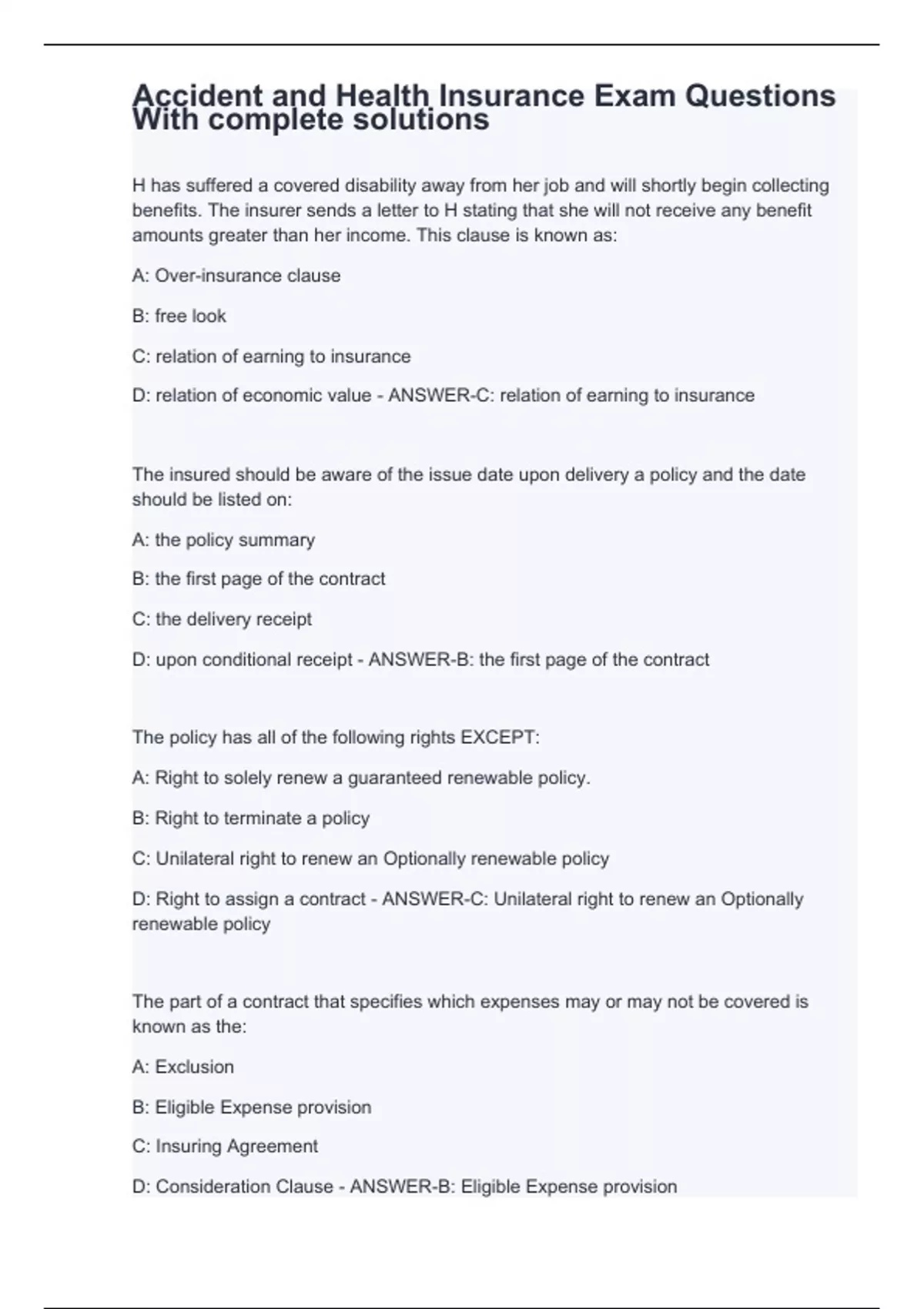 H has suffered a covered disability away from her job and will shortly begin collecting benefits. The insurer sends a letter to H stating that she will not receive any benefit amounts greater than her income. This clause is known as: A: Over-insurance clause B: free look C: relation of earning to insurance D: relation of economic value - ANSWER-C: relation of earning to insurance The insured should be aware of the issue date upon delivery a policy and the date should be listed on: A: the policy summary B: the first page of the contract C: the delivery receipt D: upon conditional receipt - ANSWER-B: the first page of the contract The policy has all of the following rights EXCEPT: A: Right to solely renew a guaranteed renewable policy. B: Right to terminate a policy C: Unilateral right to renew an Optionally renewable policy D: Right to assign a contract - ANSWER-C: Unilateral right to renew an Optionally renewable policy The part of a contract that specifies which expenses may or may not be covered is known as the: A: Exclusion B: Eligible Expense provision C: Insuring Agreement D: Consideration Clause - ANSWER-B: Eligible Expense provision