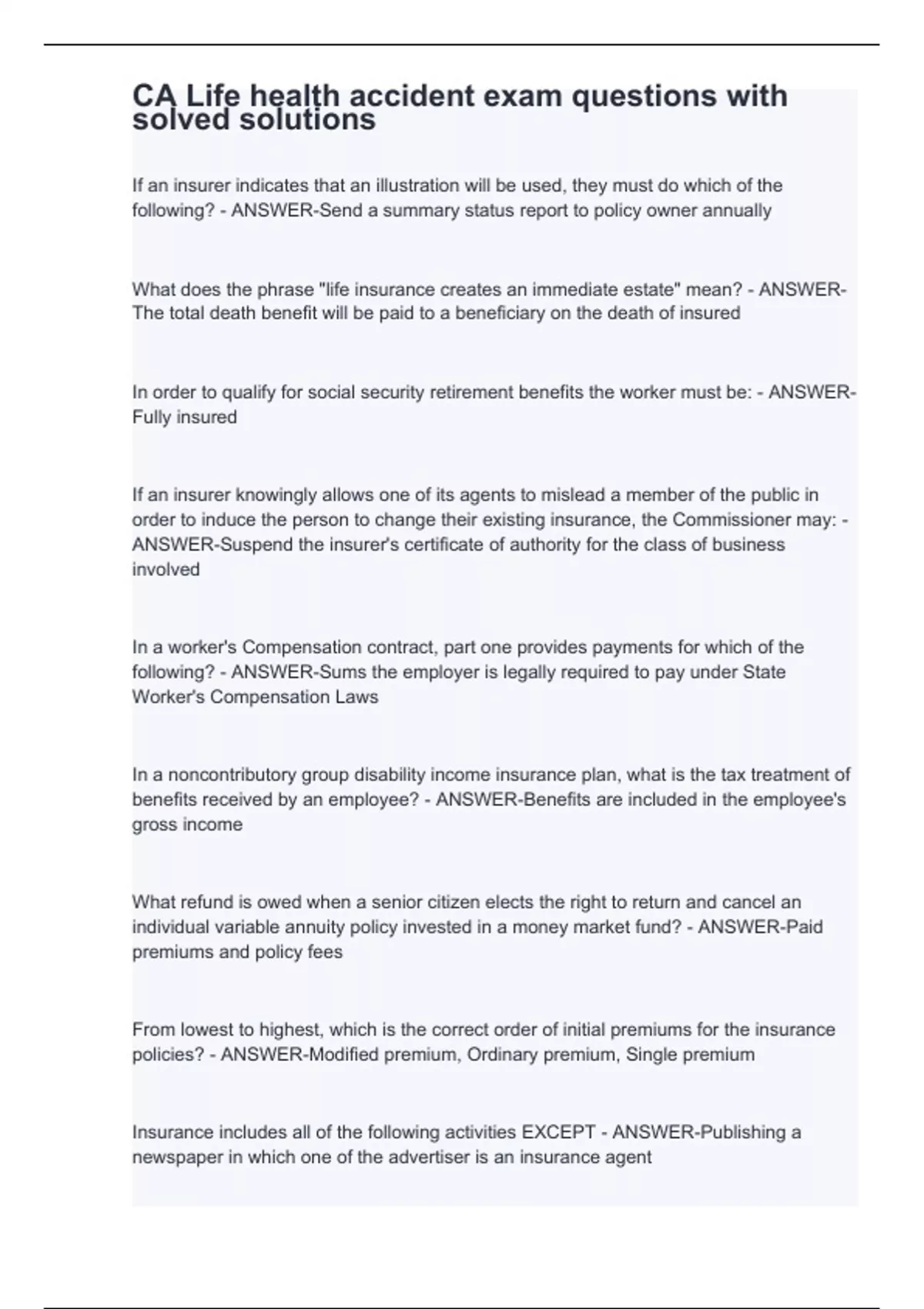 If an insurer indicates that an illustration will be used, they must do which of the following? - ANSWER-Send a summary status report to policy owner annually What does the phrase "life insurance creates an immediate estate" mean? - ANSWER-The total death benefit will be paid to a beneficiary on the death of insured In order to qualify for social security retirement benefits the worker must be: - ANSWER-Fully insured If an insurer knowingly allows one of its agents to mislead a member of the public in order to induce the person to change their existing insurance, the Commissioner may: - ANSWER-Suspend the insurer's certificate of authority for the class of business involved In a worker's Compensation contract, part one provides payments for which of the following? - ANSWER-Sums the employer is legally required to pay under State Worker's Compensation Laws In a noncontributory group disability income insurance plan, what is the tax treatment of benefits received by an employee? - ANSWER-Benefits are included in the employee's gross income What refund is owed when a senior citizen elects the right to return and cancel an individual variable annuity policy invested in a money market fund? - ANSWER-Paid premiums and policy fees From lowest to highest, which is the correct order of initial premiums for the insurance policies? - ANSWER-Modified premium, Ordinary premium, Single premium