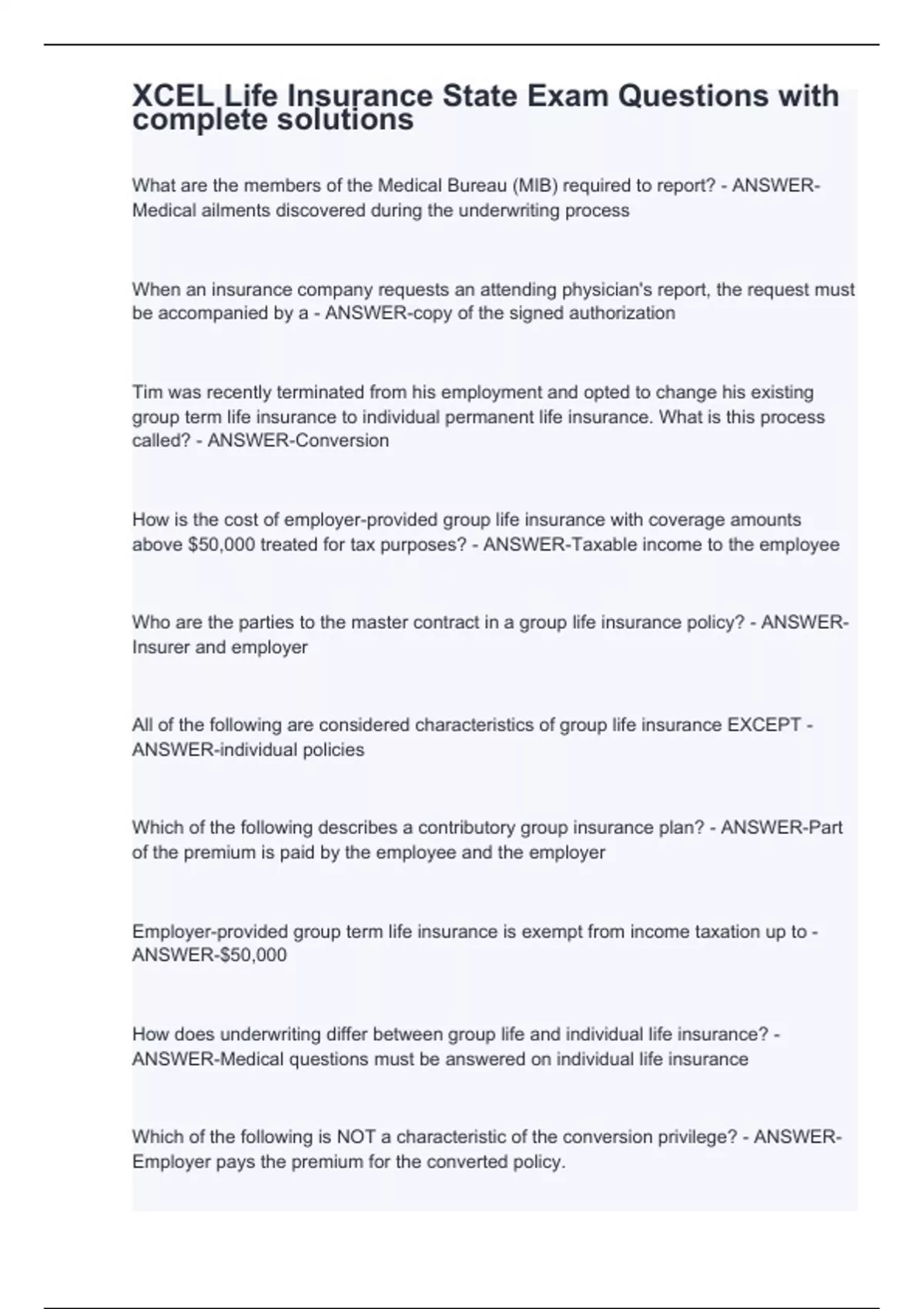 What are the members of the Medical Bureau (MIB) required to report? - ANSWER-Medical ailments discovered during the underwriting process When an insurance company requests an attending physician's report, the request must be accompanied by a - ANSWER-copy of the signed authorization Tim was recently terminated from his employment and opted to change his existing group term life insurance to individual permanent life insurance. What is this process called? - ANSWER-Conversion How is the cost of employer-provided group life insurance with coverage amounts above $50,000 treated for tax purposes? - ANSWER-Taxable income to the employee Who are the parties to the master contract in a group life insurance policy? - ANSWER-Insurer and employer All of the following are considered characteristics of group life insurance EXCEPT - ANSWER-individual policies Which of the following describes a contributory group insurance plan? - ANSWER-Part of the premium is paid by the employee and the employer Employer-provided group term life insurance is exempt from income taxation up to - ANSWER-$50,000 How does underwriting differ between group life and individual life insurance? - ANSWER-Medical questions must be answered on individual life insurance