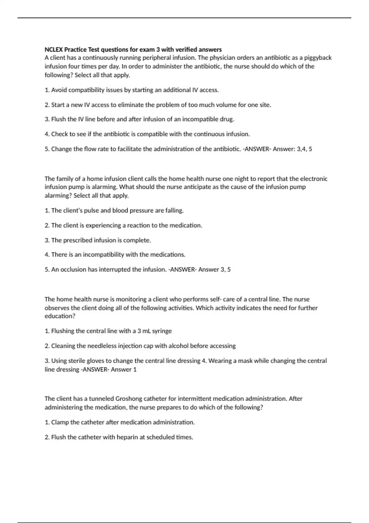 A client has a continuously running peripheral infusion. The physician orders an antibiotic as a piggyback infusion four times per day. In order to administer the antibiotic, the nurse should do which of the following? Select all that apply. 1. Avoid compatibility issues by starting an additional IV access. 2. Start a new IV access to eliminate the problem of too much volume for one site. 3. Flush the IV line before and after infusion of an incompatible drug. 4. Check to see if the antibiotic is compatible with the continuous infusion. 5. Change the flow rate to facilitate the administration of the antibiotic. -ANSWER- Answer: 3,4, 5 The family of a home infusion client calls the home health nurse one night to report that the electronic infusion pump is alarming. What should the nurse anticipate as the cause of the infusion pump alarming? Select all that apply. 1. The client's pulse and blood pressure are falling. 2. The client is experiencing a reaction to the medication. 3. The prescribed infusion is complete. 4. There is an incompatibility with the medications. 5. An occlusion has interrupted the infusion. -ANSWER- Answer 3, 5 The home health nurse is monitoring a client who performs self- care of a central line. The nurse observes the client doing all of the following activities. Which activity indicates the need for further education? 1. Flushing the central line with a 3 mL syringe 2. Cleaning the needleless injection cap with alcohol before accessing 3. Using sterile gloves to change the central line dressing 4. Wearing a mask while changing the central line dressing -ANSWER- Answer 1 The client has a tunneled Groshong catheter for intermittent medication administration. After administering the medication, the nurse prepares to do which of the following? 1. Clamp the catheter after medication administration. 2. Flush the catheter with heparin at scheduled times. 3. Flush the catheter with saline after medication administration. 4. Initiate a Valsalva maneuver when disconnecting medication tubing. -ANSWER- Answer 3 The client has a percutaneous jugular central venous line that is capped and used for intermittent infusions. After administering the medication, the best method to maintain patency