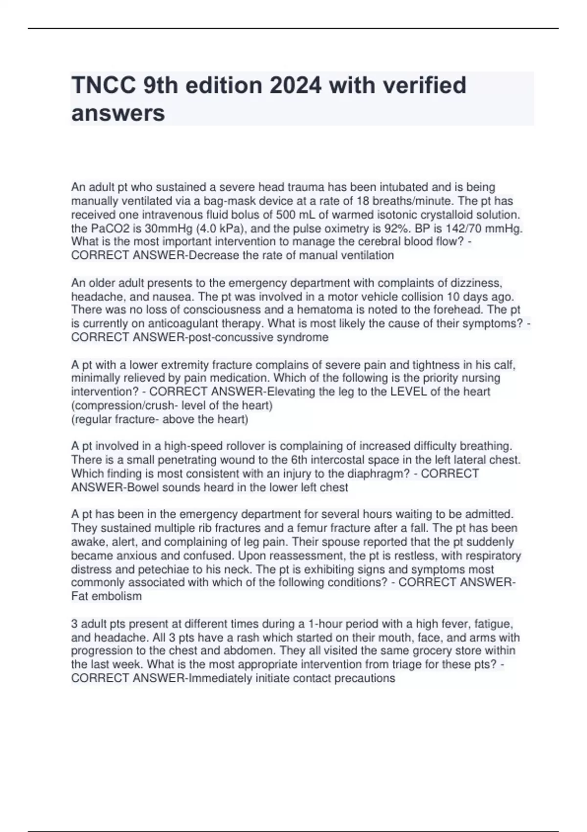 TNCC 9th edition 2024 with verified answers An adult pt who sustained a severe head trauma has been intubated and is being manually ventilated via a bag-mask device at a rate of 18 breaths/minute. The pt has received one intravenous fluid bolus of 500 mL of warmed isotonic crystalloid solution. the PaCO2 is 30mmHg (4.0 kPa), and the pulse oximetry is 92%. BP is 142/70 mmHg. What is the most important intervention to manage the cerebral blood flow? - CORRECT ANSWER-Decrease the rate of manual ventilation An older adult presents to the emergency department with complaints of dizziness, headache, and nausea. The pt was involved in a motor vehicle collision 10 days ago. There was no loss of consciousness and a hematoma is noted to the forehead. The pt is currently on anticoagulant therapy. What is most likely the cause of their symptoms? - CORRECT ANSWER-post-concussive syndrome A pt with a lower extremity fracture complains of severe pain and tightness in his calf, minimally relieved by pain medication. Which of the following is the priority nursing intervention? - CORRECT ANSWER-Elevating the leg to the LEVEL of the heart (compression/crush- level of the heart) (regular fracture- above the heart) A pt involved in a high-speed rollover is complaining of increased difficulty breathing. There is a small penetrating wound to the 6th intercostal space in the left lateral chest. Which finding is most consistent with an injury to the diaphragm? - CORRECT ANSWER-Bowel sounds heard in the lower left chest A pt has been in the emergency department for several hours waiting to be admitted. They sustained multiple rib fractures and a femur fracture after a fall. The pt has been awake, alert, and complaining of leg pain. Their spouse reported that the pt suddenly became anxious and confused. Upon reassessment, the pt is restless, with respiratory distress and petechiae to his neck. The pt is exhibiting signs and symptoms most commonly associated with which of the following conditions? - CORRECT ANSWERFat embolism 3 adult pts present at different times during a 1-hour period with a high fever, fatigue, and headache. All 3 pts have a rash which started on their mouth, face, and arms with progression to the chest and abdomen. They all visited the same grocery store within the last week. What is the most appropriate intervention from triage for these pts? - CORRECT ANSWER-Immediately initiate contact precautions