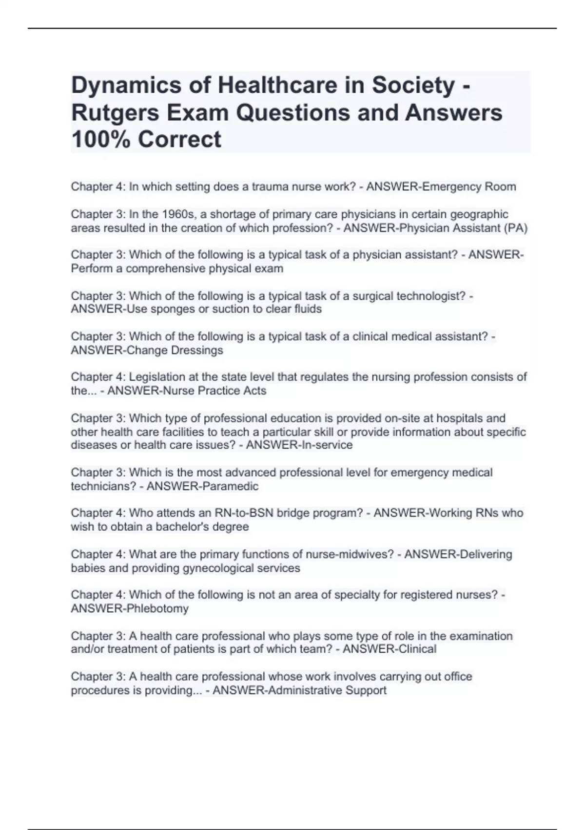 Dynamics of Healthcare in Society - Rutgers Exam Questions and Answers 100% Correct Dynamics of Healthcare in Society - Rutgers Exam Questions and Answers 100% Correct Dynamics of Healthcare in Society - Rutgers Exam Questions and Answers 100% Correct Chapter 4: In which setting does a trauma nurse work? - ANSWER-Emergency Room Chapter 3: In the 1960s, a shortage of primary care physicians in certain geographic areas resulted in the creation of which profession? - ANSWER-Physician Assistant (PA) Chapter 3: Which of the following is a typical task of a physician assistant? - ANSWER-Perform a comprehensive physical exam Chapter 3: Which of the following is a typical task of a surgical technologist? - Chapter 4: In which setting does a trauma nurse work? - ANSWER-Emergency Room Chapter 3: In the 1960s, a shortage of primary care physicians in certain geographic areas resulted in the creation of which profession? - ANSWER-Physician Assistant (PA) Chapter 3: Which of the following is a typical task of a physician assistant? - ANSWER-Perform a comprehensive physical exam Chapter 3: Which of the following is a typical task of a surgical technologist? -