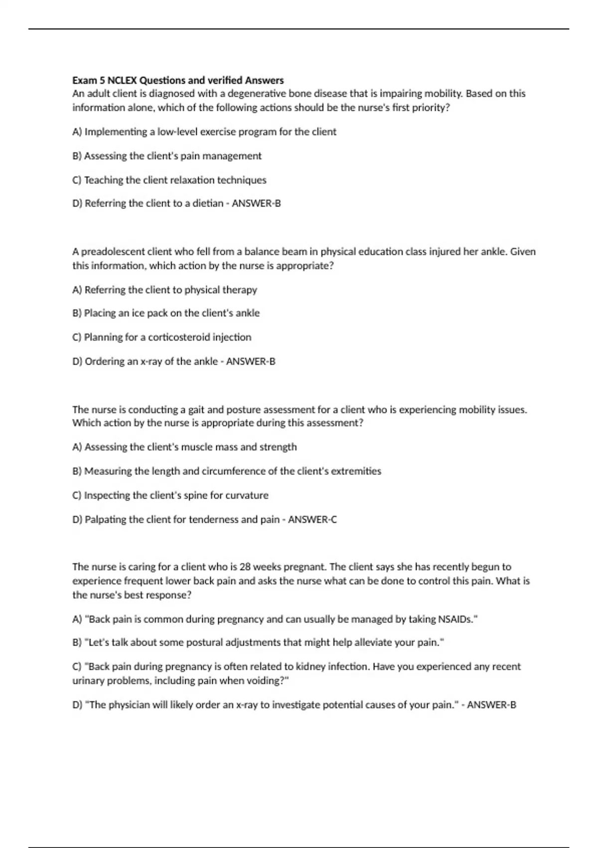 An adult client is diagnosed with a degenerative bone disease that is impairing mobility. Based on this information alone, which of the following actions should be the nurse's first priority? A) Implementing a low-level exercise program for the client B) Assessing the client's pain management C) Teaching the client relaxation techniques D) Referring the client to a dietian - ANSWER-B A preadolescent client who fell from a balance beam in physical education class injured her ankle. Given this information, which action by the nurse is appropriate? A) Referring the client to physical therapy B) Placing an ice pack on the client's ankle C) Planning for a corticosteroid injection D) Ordering an x-ray of the ankle - ANSWER-B The nurse is conducting a gait and posture assessment for a client who is experiencing mobility issues. Which action by the nurse is appropriate during this assessment? A) Assessing the client's muscle mass and strength B) Measuring the length and circumference of the client's extremities C) Inspecting the client's spine for curvature D) Palpating the client for tenderness and pain - ANSWER-C The nurse is caring for a client who is 28 weeks pregnant. The client says she has recently begun to experience frequent lower back pain and asks the nurse what can be done to control this pain. What is the nurse's best response? A) "Back pain is common during pregnancy and can usually be managed by taking NSAIDs." B) "Let's talk about some postural adjustments that might help alleviate your pain." C) "Back pain during pregnancy is often related to kidney infection. Have you experienced any recent urinary problems, including pain when voiding?" D) "The physician will likely order an x-ray to investigate potential causes of your pain." - ANSWER-B The nurse is planning care for a client who is experiencing an alteration in mobility. Which would the nurse include as an independent nursing intervention? A) Instructing on the importance of proper nutrition and an active lifestyle B) Administering a prescribed NSAID C) Identifying necessary modifications to the home environment D) Prescribing a skeletal muscle relaxant - ANSWER-A The nurse is providing care for several clients. For which client should the nurse anticipate an order for administering 1000 mg of aspirin? A) A 68-year-old client with RA who is experiencing hand pain B) A 5-year-old client who is x=experiencing ankle pain after a fall from a horse C) A 38-year-old client who is experiencing headache pain after a skiing accident D) A 70-year-old client who is experiencing back pain after laminectomy - ANSWER-A The cells that produce the matrix for bone formation are known as A) osteoclasts B) sarcomeres C) osteoblasts D) epiphyseal plates - ANSWER-C A client presents with an alteration in mobility. Which finding would suggest damage to the muscle? A) Increased PTH levels B) Decreased PTH levels C) Decreased CK levels D) Increased CK levels - ANSWER-D The nurse is providing care to a client who is experiencing back pain. Which of the following items in the client's history is a known risk factor for disc herniation? A) 49 years of age B) Female gender C) Short stature D) Anorexia - ANSWER-A A preadolescent client is recovering from spinal fusion surgery for scoliosis. Which nursing interventions should the nurse carry out to address comfort and mobility? Select all that apply. A) Reposition every 2 hours B) Monitor intake and output C) Encourage and assist with range of motion exercises every four hours while awake D) Administer pain medication around the clock E) Encourage incentive spirometer use every four hours while awake - ANSWER-A, C, D