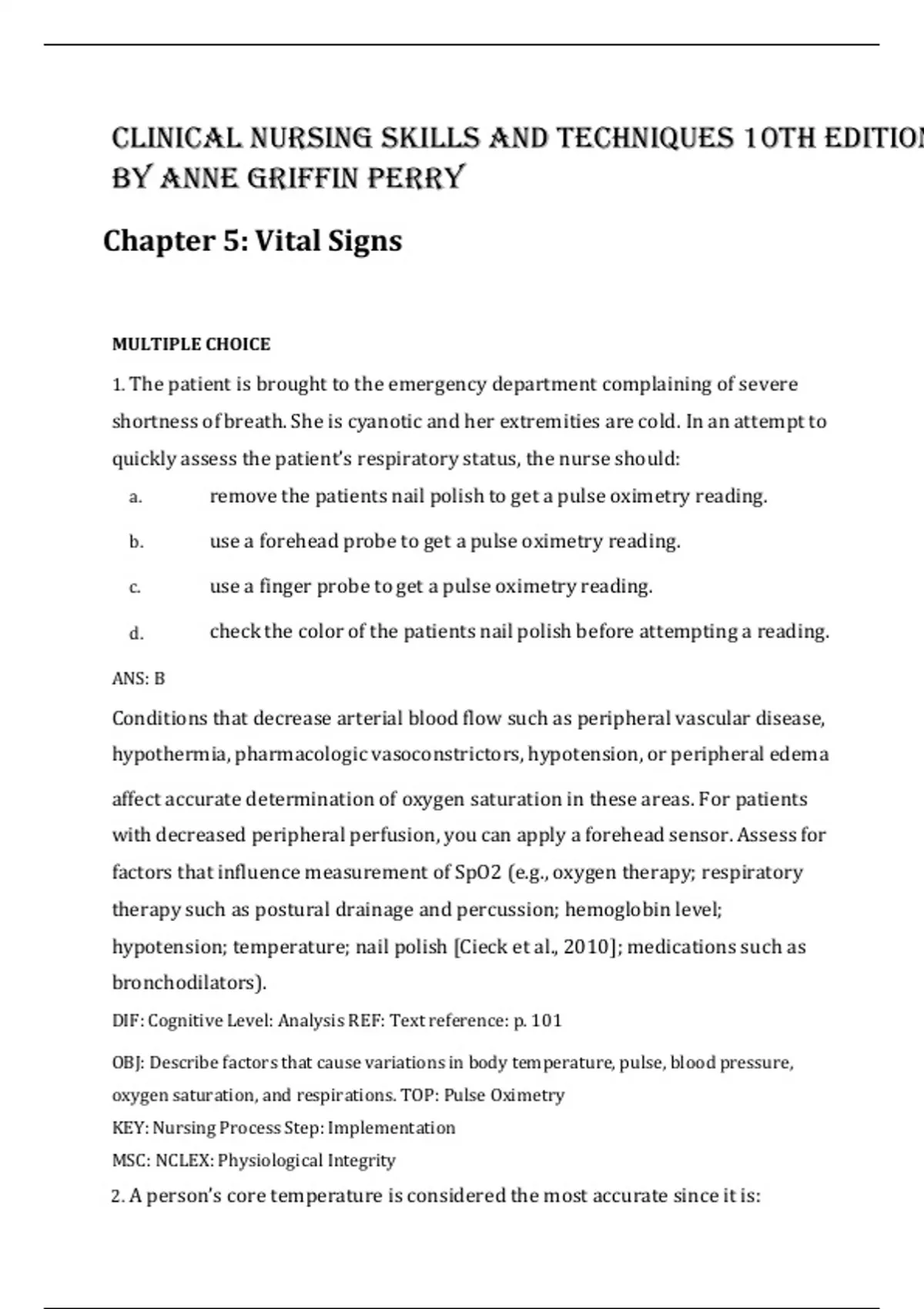 CLINICAL NURSING SKILLS AND TECHNIQUES, 10TH EDITION BY ANNE GRIFFIN PERRY ISBN- 978-0323708630 Chapter 5: Vital Signs Verified 2024 Practice Questions and 100% Correct Answers with Explanations for Exam Preparation, Graded A+ MULTIPLE CHOICE 1. The patient is brought to the emergency department complaining of severe shortness of breath. She is cyanotic and her extremities are cold. In an attempt to quickly assess the patient’s respiratory status, the nurse should: a. remove the patients nail polish to get a pulse oximetry reading. b. use a forehead probe to get a pulse oximetry reading. c. use a finger probe to get a pulse oximetry reading. d. check the color of the patients nail polish before attempting a reading. ANS: B Conditions that decrease arterial blood flow such as peripheral vascular disease, hypothermia, pharmacologic vasoconstrictors, hypotension, or peripheral edema affect accurate determination of oxygen saturation in these areas. For patients with decreased peripheral perfusion, you can apply a forehead sensor. Assess for factors that influence measurement of SpO2 (e.g., oxygen therapy; respiratory therapy such as postural drainage and percussion; hemoglobin level; hypotension; temperature; nail polish [Cieck et al., 2010]; medications such as bronchodilators). DIF: Cognitive Level: Analysis REF: Text reference: p. 101 OBJ: Describe factors that cause variations in body temperature, pulse, blood pressure, oxygen saturation, and respirations. TOP: Pulse Oximetry KEY: Nursing Process Step: Implementation MSC: NCLEX: Physiological Integrity 2. A person’s core temperature is considered the most accurate since it is: a. reflective of the surrounding environment. b. the same for everyone. c. controlled by the hypothalamus. d. independent of external influences. ANS: C The core temperature, or the temperature of the deep body tissues, is under the control of the hypothalamus and remains within a narrow range. Skin or body surface temperature rises and falls as the temperature of the surrounding environment changes, and it fluctuates dramatically. Body tissues and cells function best within a relatively narrow temperature range, from 36 C to 38 C (96.8 F to 100.4 F), but no single temperature is normal for all people. For healthy young adults, the average oral temperature is 37 C (98.6 F). An acceptable temperature range for adults depends on age, gender, range of physical activity, hydration status, and state of health. DIF: Cognitive Level: Analysis REF: Text reference: p. 67 OBJ: Describe factors that cause variations in body temperature, pulse, blood pressure, oxygen saturation, and respirations. TOP: Core Temperature KEY: Nursing Process Step: Assessment MSC: NCLEX: Physiological Integrity