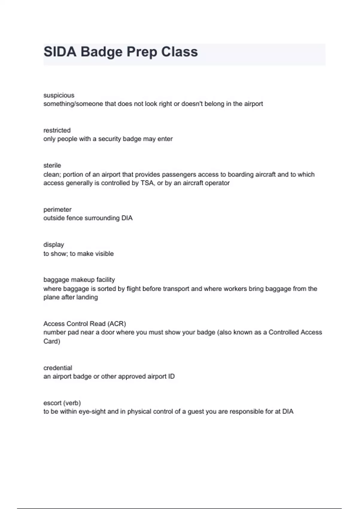 SIDA Badge Prep Class Exam Questions And Answers suspicious something/someone that does not look right or doesn't belong in the airport restricted only people with a security badge may enter sterile clean; portion of an airport that provides passengers access to boarding aircraft and to which access generally is controlled by TSA, or by an aircraft operator perimeter outside fence surrounding DIA