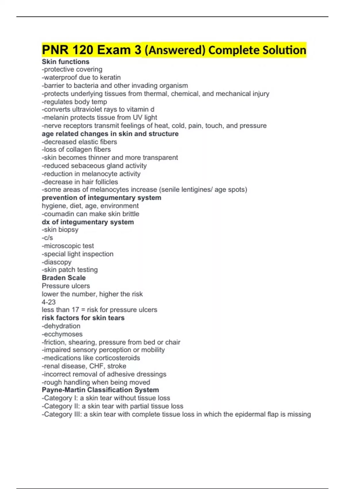 PNR 120 Exam 3 (Answered) Complete Solution Skin functions -protective covering -waterproof due to keratin -barrier to bacteria and other invading organism -protects underlying tissues from thermal, chemical, and mechanical injury -regulates body temp -converts ultraviolet rays to vitamin d -melanin protects tissue from UV light -nerve receptors transmit feelings of heat, cold, pain, touch, and pressure age related changes in skin and structure -decreased elastic fibers -loss of collagen fibers -skin becomes thinner and more transparent -reduced sebaceous gland activity -reduction in melanocyte activity -decrease in hair follicles -some areas of melanocytes increase (senile lentigines/ age spots) prevention of integumentary system hygiene, diet, age, environment -coumadin can make skin brittle dx of integumentary system -skin biopsy -c/s -microscopic test -special light inspection -diascopy -skin patch testing Braden Scale Pressure ulcers lower the number, higher the risk 4-23 less than 17 = risk for pressure ulcers risk factors for skin tears -dehydration -ecchymoses -friction, shearing, pressure from bed or chair -impaired sensory perception or mobility -medications like corticosteroids -renal disease, CHF, stroke -incorrect removal of adhesive dressings -rough handling when being moved Payne-Martin Classification System -Category I: a skin tear without tissue loss -Category II: a skin tear with partial tissue loss -Category III: a skin tear with complete tissue loss in which the epidermal flap is missing Skin Tear Protocol -Continuously cleanse the wound -Conform to the wound -Absorb exudates -Keep the wound bed moist and reduce pain and discomfort inflammatory infections examples Dermatitis, Acne, Psoriasis,Stevens-Johnson Syndrome/Toxic Epidermal Necrolysis bacterial infection examples Cellulitis, Furuncles, Carbuncles viral infection examples Herpes Simplex, Herpes Zoster fungal infection examples tinea pedis (athletes foot) tinea cruris (jock itch) tineacapitis (ringworm) tinea barbae (barber's itch) moniliasis (thrush) onychomycosis (nail fungus) parasitic infection examples Pediculosis, Scabies dermatitis types and tx -contact dermatitis: local skin irritation. Redness welling and itching -atopic dermatitis: eczema -Stasis dermatitis: Due to venous stasis. Redness, itching, and hyperpigmentation -Seborrheic dermatitis: Inflammation of the scalp and other areas. Lesions are scaly white or yellowing plaques and itching tx: avoid contact irritant or allergen, good lubrication, preserve skin moisture, control inflammation and itching, corticosteroids acne etiology, patho,s/s - papules and pustules - acne vulgaris and acne rosacea dx and tx (VADAR) -Retinoic acid (tretinoin) -Azelaic acid (azelex) -dermabrasion -Veltin Gel -Antibiotics topically and orally Psoriasis Etiology, pathophysiology, signs, and symptoms• -Noncontagious, chronic, recurring skin disorder that typically appears as inflamed, edematous skin lesions covered with adherent silvery white scales Diagnosis and treatment -History and physical examination -Mild cases and steroid creams -Tar preparations -Antimetabolites Stevens-Johnson Syndrome An allergic reaction that can include rashes, and involve the inside of the mouth. May be due to drug sensitivity. allergic reaction -carbamazepine (tegretol) -phenytoin (dilantin) -sulfadoxine-pyrimethamine (fansidar) -sulfamethoxazole-trimethoprim (bactrim, Septra) Stevens-Johnson Syndrome dx and tx lesion, discontinue drug, fluids/nutrition, analgesics, sedatives Bacterial infections tx -warm compress -incision and drainage -systemic antibiotics Cellulitis infection of dermis and tissue Furuncles boils. skin abscess of hair follicle carbuncles Group of boils. multiple heads herpes zoster viral disease affecting the peripheral nerves, characterized by painful blisters that spread over the skin following the affected nerves, usually unilateral; also known as shingles. chickenpox in children dormant and can be reactivated by trauma, malignancy, or local radiation immunocompromised individuals are at a high risk herpes simplex virus is imbedded in a nerve ganglion that innervates the site of the lesion. Lesions of lips and/or nares. usually painful but doesn't cause systemic symptoms Simplex type 2-associated with genital herpes Simples 1- lesions primarily orofacial herpes simplex dx and tx