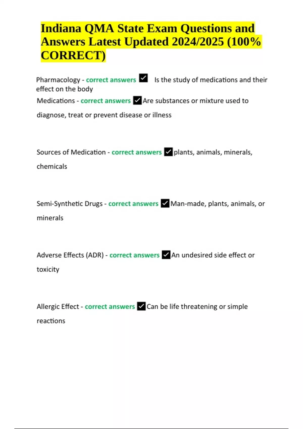 QMA Indiana State, Exam Questions and Answers Updated (100% VERIFIED) Pharmacology - correct answers Is the study of medications and their effect on the body Medications - correct answers Are substances or mixture used to diagnose, treat or prevent disease or illness Sources of Medication - correct answers plants, animals, minerals, chemicals Semi-Synthetic Drugs - correct answers Man-made, plants, animals, or minerals Adverse Effects (ADR) - correct answers An undesired side effect or toxicity Allergic Effect - correct answers Can be life threatening or simple reactions Indiana QMA State Exam Questions and Answers Latest Updated 2024/2025 (100% CORRECT) Allergic Effect - correct answers If a resident has breathing problems or a skin rash a medication was administered, the nurse must be notified immediately Side Effect - correct answers Outcome that are not intended; the action or effect of a medication other than that desired. Commonly undesirable, such as nausea, headache, insomnia, etc Toxic Effect - correct answers Occurs when too much of a medication is absorbed by the body Toxic Effect - correct answers Can be life threatening Cumulative Effect - correct answers Build up of a substance that could lead to toxicity Ointments - correct answers Must be soft enough to spread at room temperature and melt at the body temperature Indiana QMA State Exam Questions and Answers (2023- 2024) Ointment - correct answers When used for the eye must be marked "ophthalmic" (Examples- zinc, oxide ointment, and Vaseline) Half Life - correct answers The time it takes half of the medication to leave the bloodstream Short Half Life - correct answers The more often a medication must be given to maintain a constant action Half Life - correct answers If two hours then 50% of the medication will be gone from the bloodstream in two hours Tinnitus - correct answers ringing in the ears Antianxiety - correct answers anxiolytics are often referred to as (an) ______ medication-primary treat nervousness & anxiety. Aldomet - correct answers Adrenergic blocker and is used to treat hypertension Aricept - correct answers treats dementia of Alzheimer's Dilantin - correct answers treat complex partial seizures Iron - correct answers treat iron deficiency anemia Lithium - correct answers treats bipolar disorder Luminal - correct answers treats grand mal