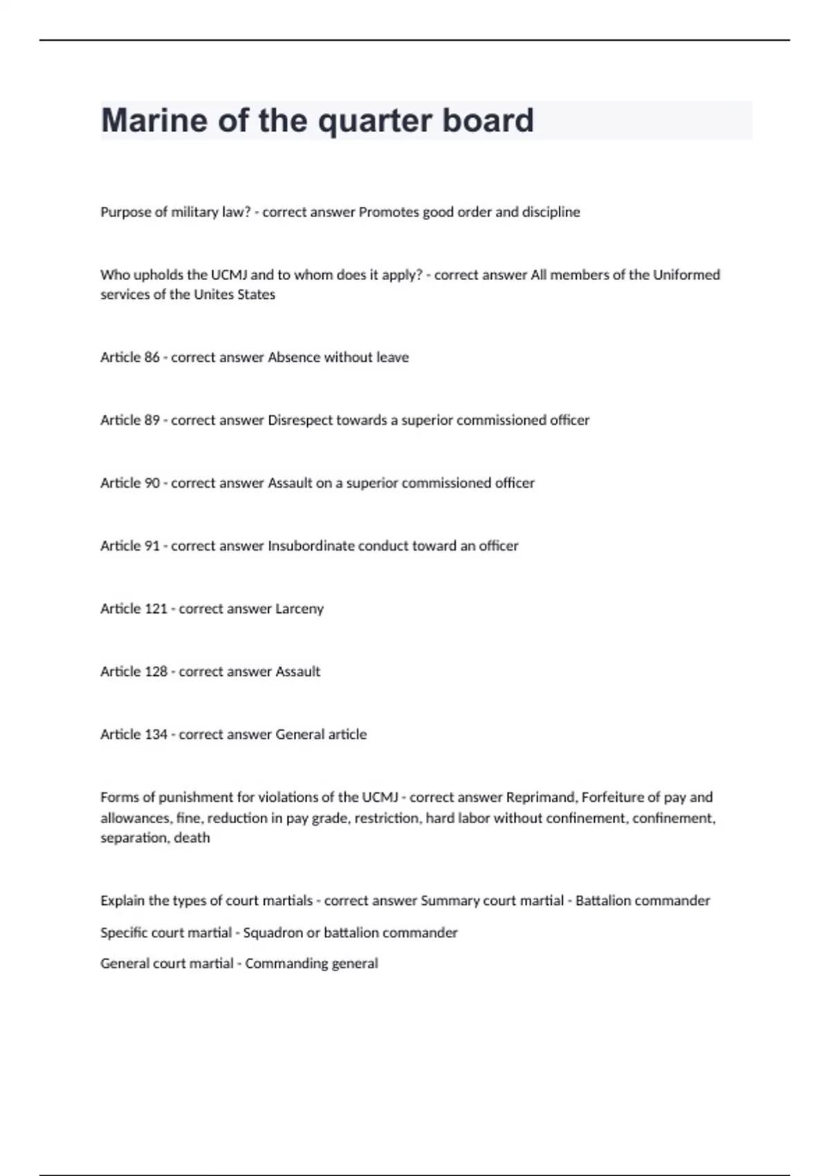 Marine of the quarter boardPurpose of military law? - correct answer Promotes good order and discipline Who upholds the UCMJ and to whom does it apply? - correct answer All members of the Uniformed services of the Unites States Article 86 - correct answer Absence without leave Article 89 - correct answer Disrespect towards a superior commissioned officer Article 90 - correct answer Assault on a superior commissioned officer Article 91 - correct answer Insubordinate conduct toward an officer Article 121 - correct answer Larceny Article 128 - correct answer Assault Article 134 - correct answer General article Forms of punishment for violations of the UCMJ - correct answer Reprimand, Forfeiture of pay and allowances, fine, reduction in pay grade, restriction, hard labor without confinement, confinement, separation, death Explain the types of court martials - correct answer Summary court martial - Battalion commander Specific court martial - Squadron or battalion commander General court martial - Commanding general