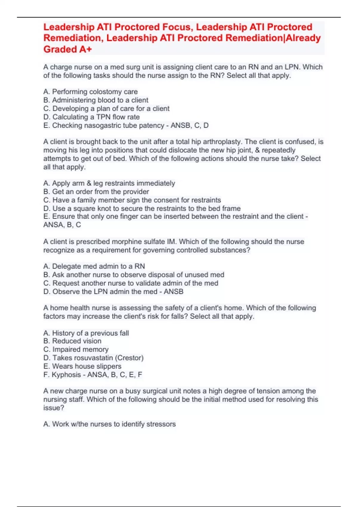 Leadership ATI Proctored Focus, Leadership ATI Proctored Remediation, Leadership ATI Proctored Remediation|Already Graded A+