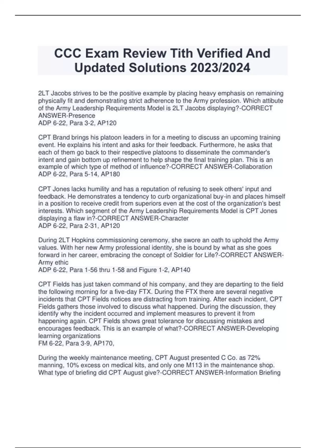 CCC Exam Review Tith Verified And Updated Solutions 2023/2024 2LT Jacobs strives to be the positive example by placing heavy emphasis on remaining physically fit and demonstrating strict adherence to the Army profession. Which attibute of the Army Leadership Requirements Model is 2LT Jacobs displaying?-CORRECT ANSWER-Presence ADP 6-22, Para 3-2, AP120 CPT Brand brings his platoon leaders in for a meeting to discuss an upcoming training event. He explains his intent and asks for their feedback. Furthermore, he asks that each of them go back to their respective platoons to disseminate the commander's intent and gain bottom up refinement to help shape the final training plan. This is an example of which type of method of influence?-CORRECT ANSWER-Collaboration ADP 6-22, Para 5-14, AP180 CPT Jones lacks humility and has a reputation of refusing to seek others' input and feedback. He demonstrates a tendency to curb organizational buy-in and places himself in a position to receive credit from superiors even at the cost of the organization's best interests. Which segment of the Army Leadership Requirements Model is CPT Jones displaying a flaw in?-CORRECT ANSWER-Character ADP 6-22, Para 2-31, AP120 During 2LT Hopkins commissioning ceremony, she swore an oath to uphold the Army values. With her new Army professional identity, she is bound by what as she goes forward in her career, embracing the concept of Soldier for Life?-CORRECT ANSWERArmy ethic ADP 6-22, Para 1-56 thru 1-58 and Figure 1-2, AP140 CPT Fields has just taken command of his company, and they are departing to the field the following morning for a five-day FTX. During the FTX there are several negative incidents that CPT Fields notices are distracting from training. After each incident, CPT Fields gathers those involved to discuss what happened. During the discussion, they identify why the incident occurred and implement measures to prevent it from happening again. CPT Fields shows great tolerance for discussing mistakes and encourages feedback. This is an example of what?-CORRECT ANSWER-Developing learning organizations FM 6-22, Para 3-9, AP170, During the weekly maintenance meeting, CPT August presented C Co. as 72% manning, 10% excess on medical kits, and only one M113 in the maintenance shop. What type of briefing did CPT August give?-CORRECT ANSWER-Information Briefing