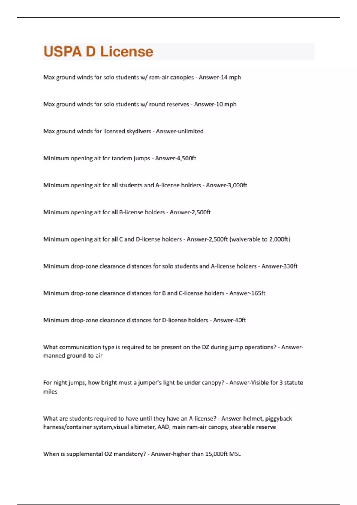 Max ground winds for solo students w/ ram-air canopies - Answer-14 mph Max ground winds for solo students w/ round reserves - Answer-10 mph Max ground winds for licensed skydivers - Answer-unlimited Minimum opening alt for tandem jumps - Answer-4,500ft Minimum opening alt for all students and A-license holders - Answer-3,000ft Minimum opening alt for all B-license holders - Answer-2,500ft Minimum opening alt for all C and D-license holders - Answer-2,500ft (waiverable to 2,000ft) Minimum drop-zone clearance distances for solo students and A-license holders - Answer-330ft Minimum drop-zone clearance distances for B and C-license holders - Answer-165ft Minimum drop-zone clearance distances for D-license holders - Answer-40ft What communication type is required to be present on the DZ during jump operations? - Answermanned ground-to-air For night jumps, how bright must a jumper's light be under canopy? - Answer-Visible for 3 statute miles What are students required to have until they have an A-license? - Answer-helmet, piggyback harness/container system,visual altimeter, AAD, main ram-air canopy, steerable reserve When is supplemental O2 mandatory? - Answer-higher than 15,000ft MSL