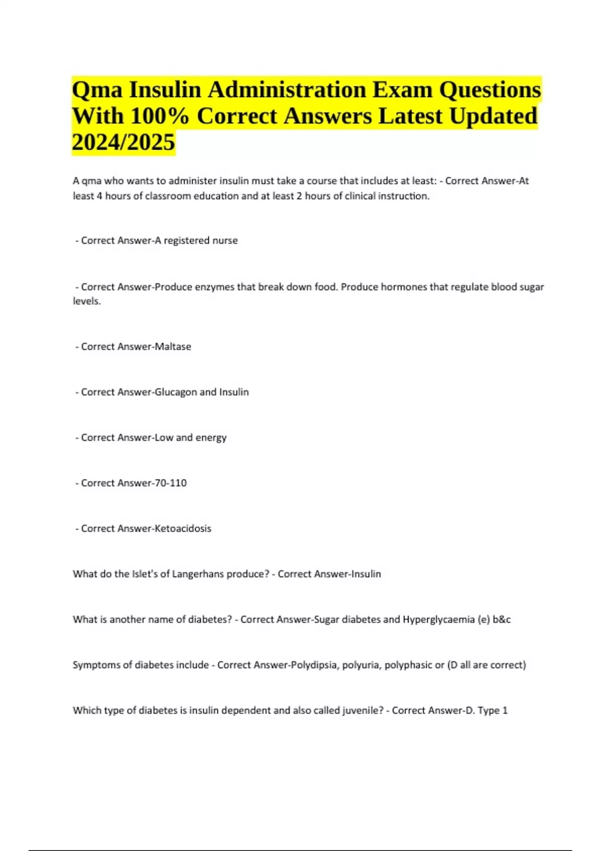 Qma Insulin Administration Exam Questions With Correct Answers Latest Updated (100% VERIFIED) A qma who wants to administer insulin must take a course that includes at least: - Correct Answer-At least 4 hours of classroom education and at least 2 hours of clinical instruction. - Correct Answer-A registered nurse - Correct Answer-Produce enzymes that break down food. Produce hormones that regulate blood sugar levels. - Correct Answer-Maltase - Correct Answer-Glucagon and Insulin - Correct Answer-Low and energy - Correct Answer-70-110 - Correct Answer-Ketoacidosis What do the Islet's of Langerhans produce? - Correct Answer-Insulin What is another name of diabetes? - Correct Answer-Sugar diabetes and Hyperglycaemia (e) b&c Symptoms of diabetes include - Correct Answer-Polydipsia, polyuria, polyphasic or (D all are correct) Which type of diabetes is insulin dependent and also called juvenile? - Correct Answer-D. Type 1 Qma Insulin Administration Exam Questions With 100% Correct Answers Latest Updated 2024/2025 All of the following are signs of hyperglycaemia EXCEPT - Correct Answer-b Diarrhea All of the following are signs of hypoglycaemia EXCEPT - Correct Answer-A. Bradycardia