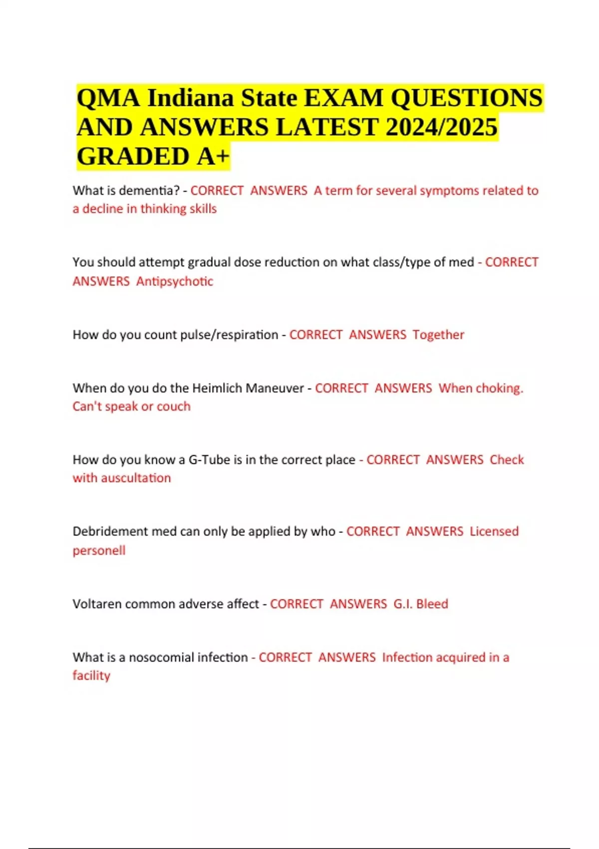 QMA Indiana State EXAM QUESTIONS AND ANSWERS LATEST (VERIFIED) What is dementia? - CORRECT ANSWERS A term for several symptoms related to a decline in thinking skills You should attempt gradual dose reduction on what class/type of med - CORRECT ANSWERS Antipsychotic How do you count pulse/respiration - CORRECT ANSWERS Together When do you do the Heimlich Maneuver - CORRECT ANSWERS When choking. Can't speak or couch How do you know a G-Tube is in the correct place - CORRECT ANSWERS Check with auscultation Debridement med can only be applied by who - CORRECT ANSWERS Licensed personell Voltaren common adverse affect - CORRECT ANSWERS G.I. Bleed What is a nosocomial infection - CORRECT ANSWERS Infection acquired in a facility QMA Indiana State EXAM QUESTIONS AND ANSWERS LATEST 2024/2025 GRADED A+ What do you need to do to mess to administer them via G-Tube - CORRECT ANSWERS Crush and dilute with water Depakote is what type of med - CORRECT ANSWERS Anticonvulsant 30 cc = - CORRECT ANSWERS 1 ounce If an inhaler holds 300 doses and is ordered to be given 2 puffs QID, how many days will it last - CORRECT ANSWERS 37.5 What do you never do if someone is having a seizure - CORRECT ANSWERS Hold them down or place anything in their mouth What should be checked before administering meds through a G-Tube - CORRECT ANSWERS Check for compatibility whether the med can be crushed and diluted with water The process by which a med is changed into a form so it can be excreted - CORRECT ANSWERS Metabolized Otic means - CORRECT ANSWERS Ear Blurred vision and yellow-green halls are side effects of what drug - CORRECT ANSWERS Digoxin A symptom of hyperglycemia - CORRECT ANSWERS Extreme thirst What affects med absorption - CORRECT ANSWERS Route, dosage, chemical composition form What is the average adult respiration rate - CORRECT ANSWERS 12-20 B/p dropping after standing up is a side effect of what - CORRECT ANSWERS Sinemet What type of med is used to treat thrombophlebitis - CORRECT ANSWERS Coumadin, blood thinners How is Micronase classified - CORRECT ANSWERS Hypoglycemia What are anti-inflammatory med used for - CORRECT ANSWERS Decrease swelling and pain What class of med is aldactone - CORRECT ANSWERS Diuretic What three things do you observe a resident for that is receiving steroid meds - CORRECT ANSWERS Infection, weight gain, osteoporosis What is a common adverse effect of vasotec - CORRECT ANSWERS Dizziness, weakness, dry cough Mixture with a fat base - CORRECT ANSWERS Emulsion Cortisporin otic is used to treat what - CORRECT ANSWERS Ear infection (otitis media) What do you need to observe/monitor for when administering anticoagulants - CORRECT ANSWERS Bleeding How is prednisone classified - CORRECT ANSWERS Anti inflammatory How is Thorazine classified - CORRECT ANSWERS Antipsychotic What might a person have after taking nitroglycerin - CORRECT ANSWERS Flushing and palpitation What type or class of med is used to treat glaucoma - CORRECT ANSWERS Beta blockers What do you give to someone with menieres disease - CORRECT ANSWERS Meclizine, antivert Fruity smelling breath is a sign of what - CORRECT ANSWERS High blood sugar (hyperglycemia) What is cardiac arrythmia - CORRECT ANSWERS Abnormal heart rate Amphojel - CORRECT ANSWERS Antacid Milk of Mag - CORRECT ANSWERS Laxative Pepcid - CORRECT ANSWERS Antacid / h2 blocker Phenergan - CORRECT ANSWERS Anti emetic Syrup of ipecac - CORRECT ANSWERS Emetic Paragoric - CORRECT ANSWERS Opiate Senokot - CORRECT ANSWERS Stimulant laxative Citrucel - CORRECT ANSWERS Bulk laxative What is the drug class of lasix - CORRECT ANSWERS Diuretic What do you give in combination with INH Therapy - CORRECT ANSWERS Rifapentine When do you have to lock your med cart - CORRECT ANSWERS When you are not at the cart What is a muscle spasm - CORRECT ANSWERS Sudden and violent tightening of the muscle EMAIL ME: EMAIL ME: What does it mean when something has a half-life or 2 hours - CORRECT ANSWERS 50% gone in 2 hours Glaucoma is a disease of the what - CORRECT ANSWERS Eyes Most medication are excreted by the what - CORRECT ANSWERS Kidney What do you need to do before administering a suspension - CORRECT ANSWERS Shake well At what pulse rate do you hold digoxin - CORRECT ANSWERS Less than 60 What good is given to someone who is hypokalemican - CORRECT ANSWERS Bananas How many times does someone get a med that is ordered BID - CORRECT ANSWERS 2 x a day
