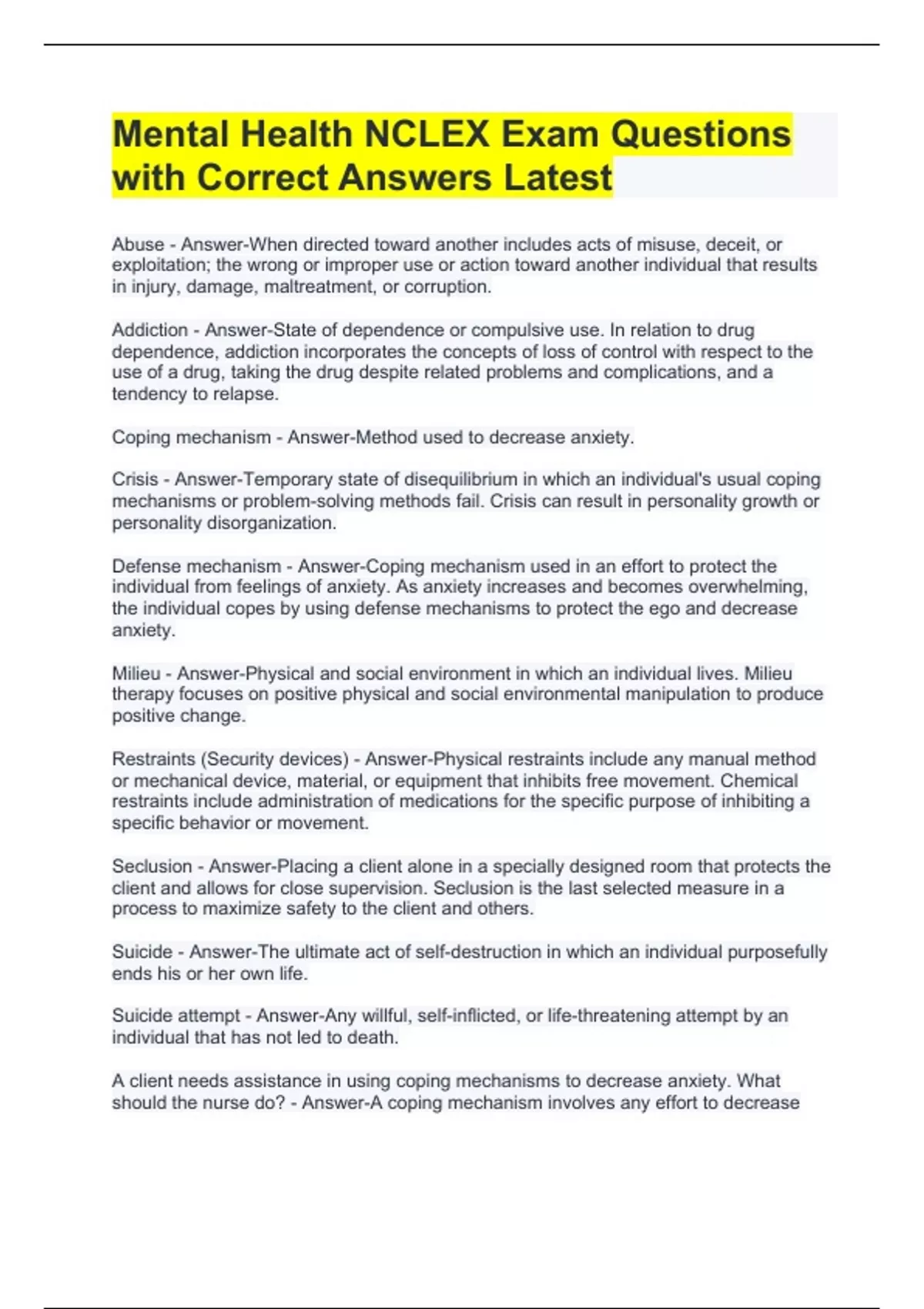 Mental Health NCLEX Exam Questions with Correct Answers Latest Milieu - Answer-Physical and social environment in which an individual lives. Milieu therapy focuses on positive physical and social environmental manipulation to produce positive change. Restraints (Security devices) - Answer-Physical restraints include any manual method or mechanical device, material, or equipment that inhibits free movement. Chemical restraints include administration of medications for the specific purpose of inhibiting a specific behavior or movement. Seclusion - Answer-Placing a client alone in a specially designed room that protects the client and allows for close supervision. Seclusion is the last selected measure in a process to maximize safety to the client and others. Suicide - Answer-The ultimate act of self-destruction in which an individual purposefully ends his or her own life. Suicide attempt - Answer-Any willful, self-inflicted, or life-threatening attempt by an individual that has not led to death. A client needs assistance in using coping mechanisms to decrease anxiety. What should the nurse do? - Answer-A coping mechanism involves any effort to decrease anxiety and can be constructive or destructive, task-oriented, or defense-oriented. The nurse should first help the client to identify the source of anxiety. Next, the nurse should explore with the client various methods to reduce anxiety, such as relaxation methods. The client may use a defense mechanism to protect himself or herself from anxiety . A defense mechanism is a coping mechanism used in an effort to protect the individual form feelings of anxiety: as anxiety increases and becomes overwhelming, the individual copes by using defense mechanisms to protect the ego and decrease anxiety, If this occurs, the nurse should facilitate appropriate and constructive use of the defense mechanism, and determine whether the defense mechanism used by the client is effective for him or her or creates additional distress. The nurse should never criticize the client's behavior or the use of deference mechanism.