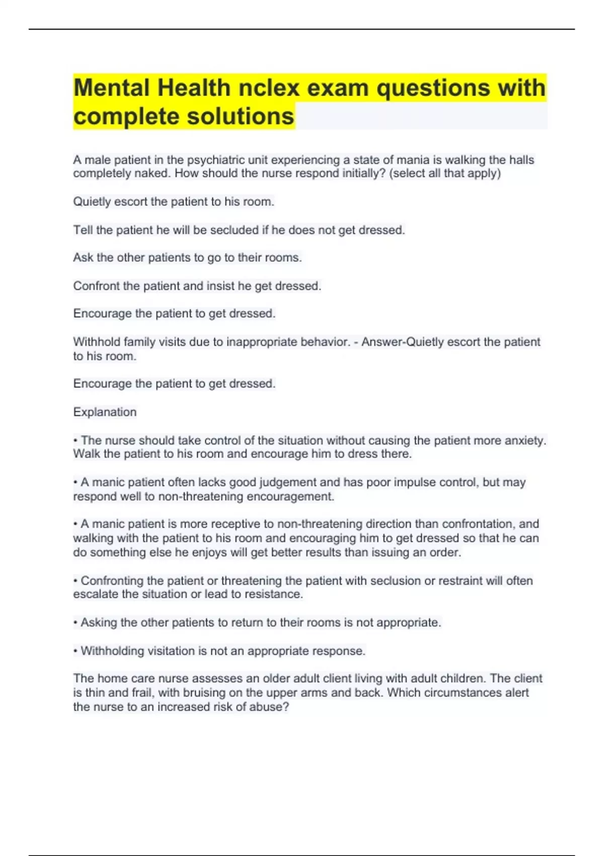 Mental Health nclex exam questions with complete solutions Physical or cognitive impairment making the client dependent on others for activities of daily living. - Financial or physical dependence on others increases the risk of elder abuse, in part because of the strain this dependency puts on the family. The vulnerable older adult may also feel unable to speak out against any mistreatment they receive, beacuase they have nowhere else to go. Explanation Elder neglect and abuse affects an estimated 2-10% of adults, but is known to be under-reported. Nurses are mandated to report known or suspected elder abuse to Adult Protective Services or to law enforcement. Signs of possible neglect or abuse include bruising, bilateral injuries, oversedation, weight loss, poor hygiene, depression, agitation, or withdrawal. Older adult clients are often unable or scared to report abuse. Abusers have various motivations including trying to get their "fair share," having a history of using physical means to solve problems, and other social, biomedical, relationship, and environmental characteristics. Although lack of support system is a risk factor for elder abuse, socioeconomic status alone does not correlate with an increased risk. Frequent ER visits do not increase risk of elder abuse, but could be the outcome of abuse. When providing care for a client who reports to the emergency department immediately after a sexual assault, which nursing actions are appropriate? Select all that apply. Offer a support person or crisis advocate Provide appropriate care for injuries Make the client sign the exam consent form Contact law enforcement Determine whether the sexual activity was consensual - Answer-Offer a support person or crisis advocate Provide appropriate care for injuries Contact law enforcement