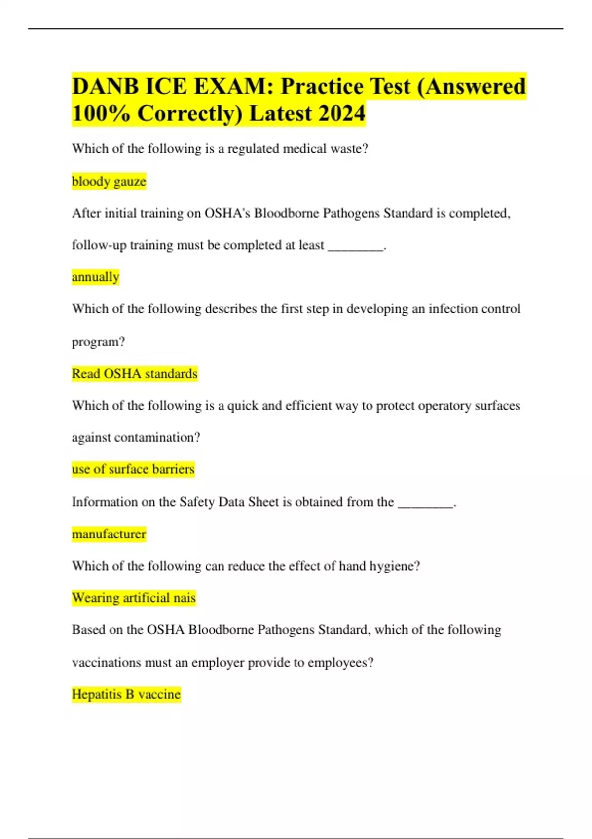 DANB ICE EXAM: Practice Test (Answered 100% Correctly) Latest 2024 Which of the following is a regulated medical waste? bloody gauze After initial training on OSHA's Bloodborne Pathogens Standard is completed, follow-up training must be completed at least ________. annually Which of the following describes the first step in developing an infection control program? Read OSHA standards Which of the following is a quick and efficient way to protect operatory surfaces against contamination? use of surface barriers Information on the Safety Data Sheet is obtained from the ________. manufacturer Which of the following can reduce the effect of hand hygiene? Wearing artificial nais Based on the OSHA Bloodborne Pathogens Standard, which of the following vaccinations must an employer provide to employees?