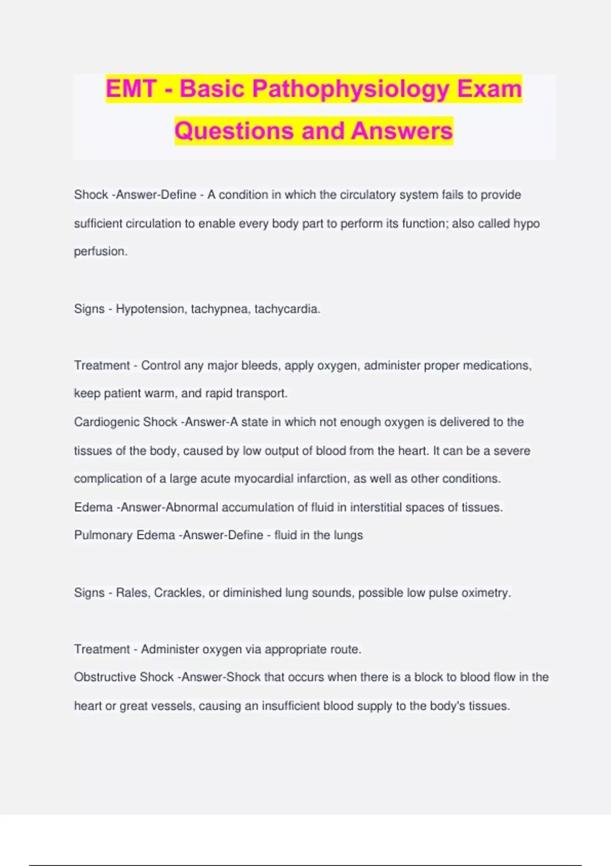 EMT - Basic Pathophysiology Exam Questions and Answers Shock -Answer-Define - A condition in which the circulatory system fails to provide sufficient circulation to enable every body part to perform its function; also called hypo perfusion. Signs - Hypotension, tachypnea, tachycardia. Treatment - Control any major bleeds, apply oxygen, administer proper medications, keep patient warm, and rapid transport. Cardiogenic Shock -Answer-A state in which not enough oxygen is delivered to the tissues of the body, caused by low output of blood from the heart. It can be a severe complication of a large acute myocardial infarction, as well as other conditions. Edema -Answer-Abnormal accumulation of fluid in interstitial spaces of tissues. Pulmonary Edema -Answer-Define - fluid in the lungs Signs - Rales, Crackles, or diminished lung sounds, possible low pulse oximetry. Treatment - Administer oxygen via appropriate route. Obstructive Shock -Answer-Shock that occurs when there is a block to blood flow in the heart or great vessels, causing an insufficient blood supply to the body's tissues. Cardiac Tamponade -Answer-Define - acute compression of the heart caused by fluid accumulation in the pericardial cavity Signs - Diminshed heart sounds, JVD, and narrowing of pule pressures. (Systolic drops and the Diastolic rises). Treatement - Oxygen, rapid transport. Tension Pneumothorax -Answer-Define - a type of pneumothorax in which air that enters the chest cavity is prevented from escaping. Signs - Drop or decline in BP, shortness of breath, diminished lung sounds, and visible cyanosis. Treatment - Oxygen via BVM, rapid transport. Pulmonary Embolism (PE) -Answer-Define - Blocking of a pulmonary artery due to a blood clot. Signs - Sudden shortness of breath, Treatment - Oxygen, rapid transport. Distributive Shock -Answer-A condition that occurs when there is widespread dilation of the small arterioles, small venules, or both. Septic Shock -Answer-Define - a serious condition that occurs when an overwhelming bacterial infection affects the body. Signs - Signs of prolonged infection, fever, low BP, tachycardia. Treatment - Oxygen, rapid transport. Neurogenic Shock -Answer-Define - a state of shock (hypo perfusion) caused by nerve paralysis that sometimes develops from spinal cord injuries. Signs - Drop in BP, Spinal trauma, absences in sweating, normal or low heart rate, normal warm skin. Treatment - C-Spine precautions, oxygen, rapid transport. Anaphylactic Shock -Answer-Define - Severe shock caused by an allergic reaction. Signs - Mild or severe itching or rash, Burning skin, low BP, generalized edema, coma, trouble breathing, angioedema. Treatment - Manage the airway (administer oxygen), Administer EpiPen, rapid transport. Psychogenic Shock -Answer-Define - Shock caused by a sudden, temporary reduction in blood supply to the brain that causes fainting (syncope). Signs - Rapid pulse, mormal or low blood pressure, syncope. Treatment - C-Spine precautions, oxygen, and transport. Hypovolemic Shock -Answer-Define - shock resulting from blood or fluid loss. Signs - Rapid weak pulse, low BP, changes in LOC, cyanosis, cool and clammy skin, increased RR, (Internal Bleeding - brusing, tenderness, distension), visible trauma and blood loss. Treatment - Contorl any major bleeders, oxygen, rapid transport. Asthma -Answer-Define - A chronic allergic disorder characterized by episodes of severe breathing difficulty, coughing, and wheezing