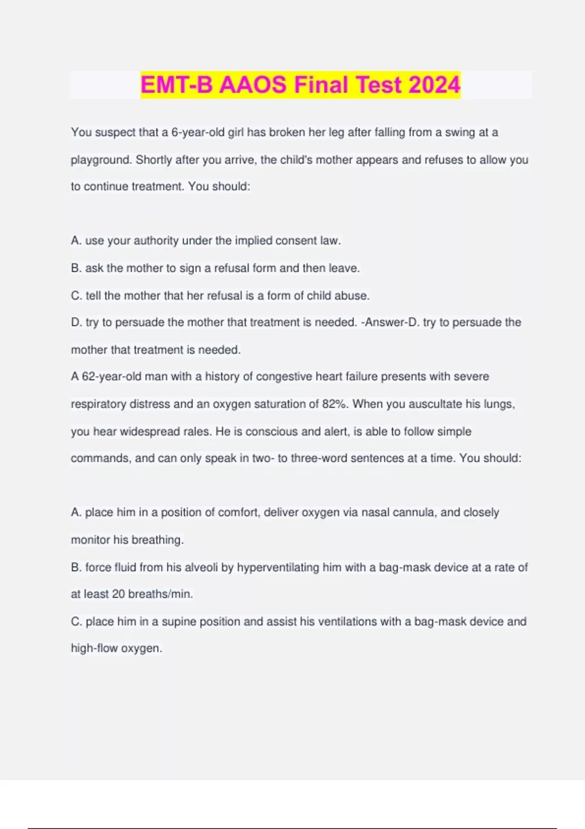 EMT-B AAOS Final Test 2024 You suspect that a 6-year-old girl has broken her leg after falling from a swing at a playground. Shortly after you arrive, the child's mother appears and refuses to allow you to continue treatment. You should: A. use your authority under the implied consent law. B. ask the mother to sign a refusal form and then leave. C. tell the mother that her refusal is a form of child abuse. D. try to persuade the mother that treatment is needed. -Answer-D. try to persuade the mother that treatment is needed. A 62-year-old man with a history of congestive heart failure presents with severe respiratory distress and an oxygen saturation of 82%. When you auscultate his lungs, you hear widespread rales. He is conscious and alert, is able to follow simple commands, and can only speak in two- to three-word sentences at a time. You should: A. place him in a position of comfort, deliver oxygen via nasal cannula, and closely monitor his breathing. B. force fluid from his alveoli by hyperventilating him with a bag-mask device at a rate of at least 20 breaths/min. C. place him in a supine position and assist his ventilations with a bag-mask device and high-flow oxygen. D. apply a continuous positive airway pressure (CPAP) device, monitor his blood pressure, and observe him for signs of improvement or deterioration. -Answer-D. apply a continuous positive airway pressure (CPAP) device, monitor his blood pressure, and observe him for signs of improvement or deterioration. A 6-year-old male presents with acute respiratory distress. His mother states that she saw him put a small toy into his mouth shortly before the episode began. The child is conscious, obviously frightened, and is coughing forcefully. You should: A. encourage him to cough, give oxygen as tolerated, and transport. B. deliver a series of five back blows and then reassess his condition. C. place the child in a supine position and perform abdominal thrusts. D. carefully look into his mouth and remove the object if you see it. -Answer-A. encourage him to cough, give oxygen as tolerated, and transport. A 33-year-old woman who is 36 weeks pregnant is experiencing scant vaginal bleeding. During transport, you note that she suddenly becomes diaphoretic, tachycardic, and hypotensive. In addition to administering 100% oxygen, you should: A. place her in a left lateral recumbent position. B. position her supine and elevate her legs 12″. C. carefully place sterile gauze into her vagina. D. assist her ventilations with a bag-mask device. -Answer-A. place her in a left lateral recumbent position. A 19-year-old female is found unconscious by her roommate. Your primary assessment reveals that her breathing is inadequate. As you insert an oropharyngeal airway, she begins to gag violently. You should: A. insert the airway no further but leave it in place as a bite block. B. select a smaller oropharyngeal airway and attempt to insert it. C. remove the airway and be prepared to suction her oropharynx. D. continue to insert the airway as you suction her oropharynx. -Answer-C. remove the airway and be prepared to suction her oropharynx. A 37-year-old male has an apparent foreign body airway obstruction. He is conscious and alert and is coughing forcefully. His skin is pink, warm, and moist. The MOST appropriate treatment for this patient includes: A. performing a series of abdominal thrusts. B. finger sweeps to remove the obstruction. C. encouraging him to cough and transporting. D. a series of back blows and chest thrusts. -Answer-C. encouraging him to cough and transporting. Febrile seizures: A. are usually benign but should be evaluated. B. are also referred to as petit mal seizures. C. often result in permanent brain damage. D. occur when a child's fever progressively rises. -Answer-A. are usually benign but should be evaluated. A 17-year-old football player collided with another player and has pain to his left clavicular area. He is holding his arm against his chest and refuses to move it. Your assessment reveals obvious deformity to the midshaft clavicle. After assessing distal pulse, sensory, and motor functions, you should: A. straighten his arm and apply a board splint. B. perform a rapid secondary assessment. C. immobilize the injury with a sling and swathe. D. place a pillow under his arm and apply a sling. -Answer-C. immobilize the injury with a sling and swathe. A child who has no recent history of illness suddenly appears cyanotic and cannot speak after playing with a small toy. You should: A. perform abdominal thrusts. B. give oxygen and transport at once. C. perform a blind finger sweep. D. visualize the child's airway. -Answer-A. perform abdominal thrusts. A major benefit when using a multilumen airway device is that: A. maintenance of a mask-to-face seal is not required. B. the airway is better protected than with an ET tube. C. it can be used on patients of any age and size. D. it can be visualized as it enters the esophagus. -Answer-C. it can be used on patients of any age and size. A patient with a head injury presents with abnormal flexion of his extremities. What numeric value should you assign to him for motor response? A. 5 B. 3 C. 2 D. 4 -Answer-C. 2 During the primary assessment of a semiconscious 70-year-old female, you should: A. immediately determine the patient's blood glucose level. B. insert a nasopharyngeal airway and assist ventilations. C. ensure a patent airway and support ventilation as need