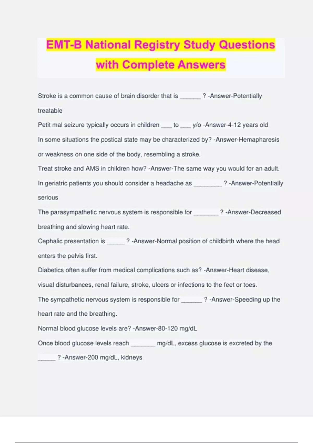 EMT-B National Registry Study Questions with Complete Answers Stroke is a common cause of brain disorder that is ______ ? -Answer-Potentially treatable Petit mal seizure typically occurs in children ___ to ___ y/o -Answer-4-12 years old In some situations the postical state may be characterized by? -Answer-Hemapharesis or weakness on one side of the body, resembling a stroke. Treat stroke and AMS in children how? -Answer-The same way you would for an adult. In geriatric patients you should consider a headache as ________ ? -Answer-Potentially serious The parasympathetic nervous system is responsible for _______ ? -Answer-Decreased breathing and slowing heart rate. Cephalic presentation is _____ ? -Answer-Normal position of childbirth where the head enters the pelvis first. Diabetics often suffer from medical complications such as? -Answer-Heart disease, visual disturbances, renal failure, stroke, ulcers or infections to the feet or toes. The sympathetic nervous system is responsible for ______ ? -Answer-Speeding up the heart rate and the breathing. Normal blood glucose levels are? -Answer-80-120 mg/dL Once blood glucose levels reach _______ mg/dL, excess glucose is excreted by the _____ ? -Answer-200 mg/dL, kidneys A 73 y/o woman was in her backyard gardening when she collapsed to the ground. Her husband told 911 that "she is breathing very fast and will not talk to me." You arrive to find the woman lying on her side in the grass. She is breathing at 7 breaths per minute and her pulse is irregular and very thready. Her lungs also present with crackles upon auscultation As you are taking a blood pressure (88/66) the husband tells you that the woman has been having jaw pain and some weakness for approximately 3 days. What is the most likely cause of this woman's condition and how would you treat her? - Answer-Cardiogenic shock, assist ventilations and transport. The woman is likely experiencing pump failure and is hypoperfusing. Name the forms of medication (hint- there's 8) -Answer-1). compressed powder/tablet 2). liquid injection 3). gel 4). suspension (must shake!) 5). gas 6). spray 7). fine powder for inhalation (i.e. MDI's) 8). liquid vaporized fixed dose nebulizer (compressed gas) Routes of medication administration -Answer-1). sublingual 2). oral (swallowed) 3). inhalation 4). injection Medication name types -Answer-1). chemical name 2). generic name 3). trade (brand) name 4). official name Epinephrine stimulates four receptors, what are they? -Answer-Alpha 1 & 2, Beta 1 & 2. These properties make up the sympathetic nervous system. **Beta 1- speeds up heart rate Beta 2 agonist drug causes ______ to dilate. -Answer-Bronchioles Epinephrine is a ________ ? -Answer-Vasoconstrictor, bronchodilator, and decreases capillary permeability (to reduce fluid leakage). Nitroglycerin is a __________ ? -Answer-Vasodilator. (Main side effect: hypotension, causes headache) Define a "drug". -Answer-A chemical substance used to treat or prevent a disease or condition. Define a "medication". -Answer-A drug or other substance used as a remedy for illness. The bronchioles are lined _______ and _______. -Answer-Lined with smooth muscle and mucous membranes. The ____ lung is slightly larger than the ______ lung. -Answer-Right lung, larger than the left. Brain cells only use ______ for energy. -Answer-Glucose Trachea posterior wall is _________ ? -Answer-Made up of muscle therefore not a rigid structure. The first few levels of bronchi are ________ ? -Answer-Supported by rings of cartilage. The trachea (aka "windpipe") extends from the _____ to the ______. -Answer-Larynx to the carina. The lower airway extends from the ______ to the ______. -Answer-Cricoid cartilage to the alveoli of the lungs. Name the possible positions in which to place a patient. -Answer-1). Supine 2). Prone 3). Fowlers: (sitting up) patient's upper body is at a 45-60 degree angle. 4). Semi-fowlers: patient's upper body is at less than a 45 degree angle. 5). Trendelenberg: patient's legs are elevated higher than the head. 6). Shock position 7). Lateral recumbent: (recovery position) patient is laying on their left or right side. "Ipsilateral" refers to _______ ? -Answer-The same side. "Contralateral" refers to _______ ? -Answer-The opposite side. Plantar & palmar refer to _______ ? -Answer-The sole of the foot and the palm of the hand. Ligaments connect ______ to ______. -Answer-Bone to bone. Tendons connect ________ to ______. -Answer-Muscle to bone. The skeletal system serves 4 main functions, what are they? -Answer-1). Gives the body shape. 2). Provides protection of vital internal organs. 3). Allows for movement. 4). Stores minerals and produces blood cells. Name the 6 main components of the skeletal system. -Answer-1). Skull 2). Spinal column 3). Thorax 4). Pelvis 5). Upper extremities 6). Lower extremities Name the skeletal components of the skull. -Answer-Interlocking bones: the occipital, two parietal, two temporal, the frontal. Name the skeletal components of the face. -Answer-14 bones, 13 of which are immovable & interlocking. Includes: orbits, nasal bones, the maxillae (upper jaw), the zygomatic (cheek) bones, the mandible (lower jaw, strongest bone in the face). What is an intervertebral disc? -Answer-A fluid pad of tough elastic cartilage between each vertebrae. It acts as a shock absorber & allows for movement of spine. The thorax (aka the chest) is composed of what? -Answer-The ribs, sternum and thoracic spine. The ____ ribs are ______ arches of bone, which are arranged in _____ and are attached by ______ to the ________. -Answer-The 24 ribs are semi-flexible arches of bone, which are arranged in 12 pairs and are attached posteriorly by ligaments to the 12 thoracic vertebrae. Name the components of the midline area (abdominal quadrant). -Answer--the aorta -pancreas -small intestine