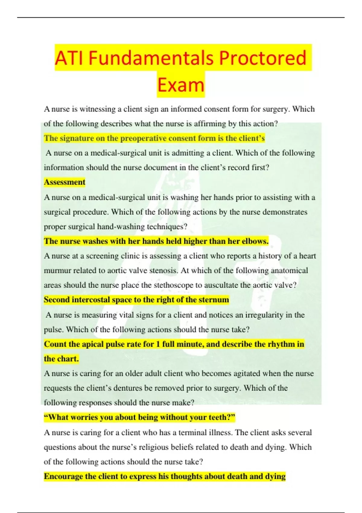 ATI Fundamentals Proctored Exam A nurse is witnessing a client sign an informed consent form for surgery. Which of the following describes what the nurse is affirming by this action? The signature on the preoperative consent form is the client’s A nurse on a medical-surgical unit is admitting a client. Which of the following information should the nurse document in the client’s record first? Assessment A nurse on a medical-surgical unit is washing her hands prior to assisting with a surgical procedure. Which of the following actions by the nurse demonstrates proper surgical hand-washing techniques? The nurse washes with her hands held higher than her elbows. A nurse at a screening clinic is assessing a client who reports a history of a heart murmur related to aortic valve stenosis. At which of the following anatomical areas should the nurse place the stethoscope to auscultate the aortic valve? Second intercostal space to the right of the sternum A nurse is measuring vital signs for a client and notices an irregularity in the pulse. Which of the following actions should the nurse take? Count the apical pulse rate for 1 full minute, and describe the rhythm in the chart. A nurse is caring for an older adult client who becomes agitated when the nurse requests the client’s dentures be removed prior to surgery. Which of the following responses should the nurse make? “What worries you about being without your teeth?” A nurse is caring for a client who has a terminal illness. The client asks several questions about the nurse’s religious beliefs related to death and dying. Which of the following actions should the nurse take? Encourage the client to express his thoughts about death and dying A nurse is caring for a client who has Type 1 diabetes mellitus and is resistant to learning self-injection of insulin. Which of the following statements should the nurse make? “Tell me what I can do to help you overcome your fear of giving yourself injections.” A charge nurse is teaching adult cardiopulmonary resuscitation (CPR) to a group of newly licensed nurses. Which of the following actions should the charge nurse teach as the first response in CPR? Confirm unresponsiveness. A community health nurse is preparing a campaign about seasonal influenza. Which of the following plans should the nurse include as a secondary prevention? Screening groups of older adults in nursing care facilities for early influenza manifestations A nurse is preparing to provide tracheostomy care for a client. Which of the following actions should the nurse take first? Perform hand hygien