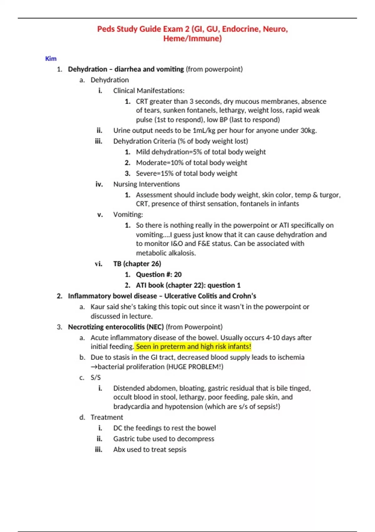 Kim 1. Dehydration – diarrhea and vomiting (from powerpoint) a. Dehydration i. Clinical Manifestations: 1. CRT greater than 3 seconds, dry mucous membranes, absence of tears, sunken fontanels, lethargy, weight loss, rapid weak pulse (1st to respond), low BP (last to respond) ii. Urine output needs to be 1mL/kg per hour for anyone under 30kg. iii. Dehydration Criteria (% of body weight lost) 1. Mild dehydration=5% of total body weight 2. Moderate=10% of total body weight 3. Severe=15% of total body weight iv. Nursing Interventions 1. Assessment should include body weight, skin color, temp & turgor, CRT, presence of thirst sensation, fontanels in infants v. Vomiting: 1. So there is nothing really in the powerpoint or ATI specifically on vomiting….I guess just know that it can cause dehydration and to monitor I&O and F&E status. Can be associated with metabolic alkalosis. vi. TB (chapter 26) 1. Question #: 20 2. ATI book (chapter 22): question 1 2. Inflammatory bowel disease – Ulcerative Colitis and Crohn’s a. Kaur said she’s taking this topic out since it wasn’t in the powerpoint or discussed in lecture. 3. Necrotizing enterocolitis (NEC) (from Powerpoint) a. Acute inflammatory disease of the bowel. Usually occurs 4-10 days after initial feeding. Seen in preterm and high risk infants! b. Due to stasis in the GI tract, decreased blood supply leads to ischemia →bacterial proliferation (HUGE PROBLEM!) c. S/S i. Distended abdomen, bloating, gastric residual that is bile tinged, occult blood in stool, lethargy, poor feeding, pale skin, and bradycardia and hypotension (which are s/s of sepsis!) d. Treatment i. DC the feedings to rest the bowel ii. Gastric tube used to decompress iii. Abx used to treat sepsis iv. Sx may be indicated to remove necrotizing tissue e. Nursing Care i. Monitor VS and gastric residuals ii. Eval stool and abdominal girth iii. Re-establish feeding (breast milk) and monitor tolerance 4. Hirschsprung’s disease (ATI book and powerpoint) a. Lack of ganglionic cells in the segments of the colon resulting in ↓motility and mechanical obstruction. No peristaltic waves in the affected portion of the bowel causing obstruction and distention. b. S/S i. Failure to pass meconium w/i 24-48 hrs after birth ii. Episodes of vomiting bile, poor feeding iii. Abdominal distention/constipation iv. Foul smelling, ribbon like stool! c. Surgical removal of the affected portion is needed. Temporary colostomy may be required d. Nursing Interventions i. High protein, high calorie, low fiber diet ii. Educate parents on colostomy care. e. TB (chapter 26) i. Question #: 6, 7, 8, 9, 38 39 ii. ATI book (chapter 23): question 2 iii. 5. GERD (ATI book and powerpoint) a. Primarily due to an incompetent LES, gastric contents regurg into esophagus. Peak incidence is around 4 mo. old, usually resolves by 1 yr. b. S/S i. Spitting up, forceful vomiting, aspiration may lead to resp. Signs, ulceration and bleeding c. Nursing Management i. Offer small, frequent feedings. ii. Thicken formula with rice cereal iii. Position the child with head elevated after meals. At least an hour at a 30° angle. iv. Can administer antacids before meals or at bedtime. Ranitidine commonly used. v. Nissen fundoplication sx used for patients who have severe cases. vi. TB (chapter 26) 1. Question #: 10, 11, 24, 25, 41, 46, 47. SATA #: 1, 5, 11 2. ATI book (chapter 23): question 5 Mae 6. Appendicitis/Appendectomy (ATI/other version of PPT in portal) a. Etiology/Pathophysiology: 1. Inflammation of the vermiform appendix caused from an obstruction of the lumen of the appendix 2. Obstruction causing inflammation and ischemia → can rupture → peritonitis 3. Average client age is 10 years b. S/S: 1. Abdominal pain in the RLQ 2. Decreased or absent bowel sounds 3. Fever 4. Lethargy 5. Tachycardia 6. Diarrhea or constipation 7. Rapid, shallow breathing 8. Anorexia 9. Possible vomiting 10. “Colicky, cramping, abdominal pain around the umbilicus” c. Lab tests: 1. CBC 2. Urinalysis d. Diagnostic Procedures: 1. Computed tomography scan shows an enlarged diameter of appendix, as well as thickening of the appendiceal wall 2. Including pain: “McBurney’s point” e. Management: 1. Surgery, antibiotics, IV fluids, pain meds with caution, antipyretics, antiemetics f. Nursing care: 1. **Avoid applying heat to the abdomen, enemas or laxatives g. Therapeutic Procedures 1. Appendectomy: treatment for simple or perforated appendicitis 2. Laparoscopic procedure: provides quick recovery for simple appendicitis a. Laparoscopic surgery: removal of the non ruptured appendix b. Laparoscopic or open surgery: removal of the ruptured appendix h. Complications: 1. Peritonitis (inflammation of the peritoneal cavity) i. TB (Chapter 26) i. Question #: 13, 14, 15, 48 and SATA #: 9 7. Cleft lip and palate a. Etiology/Pathophysiology: 1. Lip: visible separation from the upper lip toward the nose 2. Palate: visible or palpable opening of the palate connecting the mouth and the nasal cavity b. Risk Factors: 1. Family history 2. Environmental factors: exposure to teratogens, alcohol, smoking, medications & low folic acid 3. Other syndromes (ATI) c. S/S: 1. Feeding difficulties 2. Speech difficulties 3. Recurrent otitis media (related to altered structure) d. Medical management: 1. Surgical closure 2. Surgery, speech therapy 3. Cleft lip: repair is done b/w 2-3 mo of age 4. Cleft palate: repair is done b/w 6-12 mo of age e. Nursing Interventions: 1. Ensure adequate intake of food and fluids without aspiration 2. Special feeding devices may be used 3. Frequent burping is necessary 4. Assist parents in dealing with the diagnosis f. Procedure nursing care: 1. Pre-op: - assess ability to suck, position the infant upright while cradling the head during feeding, use a wide-based nipple for bottle feeding (only for isolated cleft lip), burp the infant frequently, 2. Post-op: - ABCs, wound care, monitor for bleeding, clear liquid to soft diet, **AVOID havin