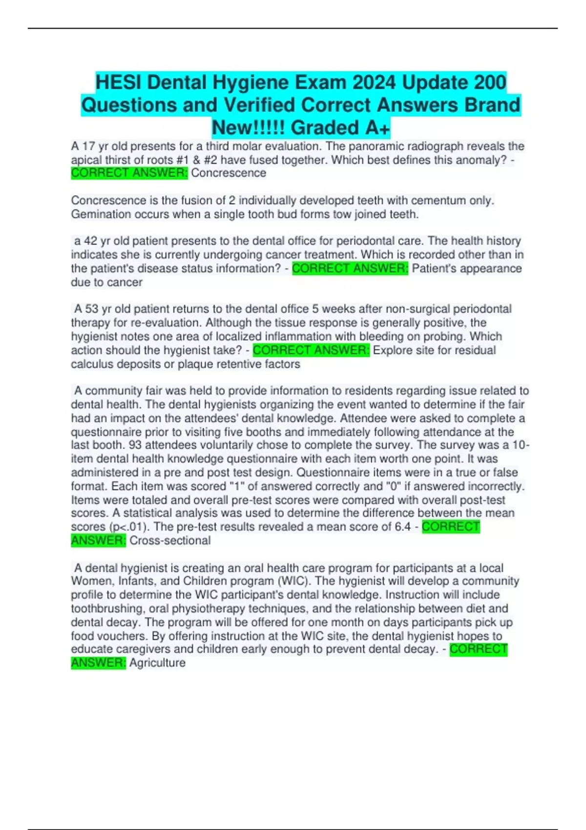 HESI Dental Hygiene Exam 2024 Update 200 Questions and Verified Correct Answers Brand New!!!!! Graded A+