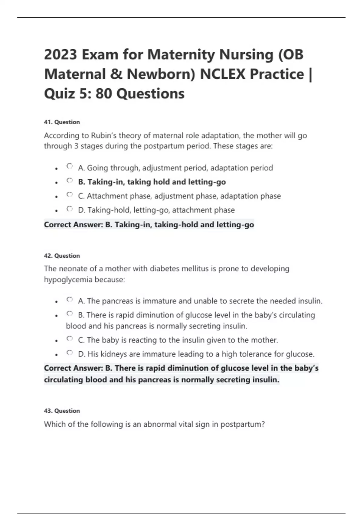 According to Rubin’s theory of maternal role adaptation, the mother will go through 3 stages during the postpartum period. These stages are: • A. Going through, adjustment period, adaptation period • B. Taking-in, taking hold and letting-go • C. Attachment phase, adjustment phase, adaptation phase • D. Taking-hold, letting-go, attachment phase Correct Answer: B. Taking-in, taking-hold and letting-go 42. Question The neonate of a mother with diabetes mellitus is prone to developing hypoglycemia because: • A. The pancreas is immature and unable to secrete the needed insulin. • B. There is rapid diminution of glucose level in the baby’s circulating blood and his pancreas is normally secreting insulin. • C. The baby is reacting to the insulin given to the mother. • D. His kidneys are immature leading to a high tolerance for glucose. Correct Answer: B. There is rapid diminution of glucose level in the baby’s circulating blood and his pancreas is normally secreting insulin. 43. Question Which of the following is an abnormal vital sign in postpartum? • A. Pulse rate between 50-60/min • B. BP diastolic increase from 80 to 95mm Hg • C. BP systolic between 100-120mm Hg • D. Respiratory rate of 16-20/min Correct Answer: B. BP diastolic increase from 80 to 95mm Hg 44. Question The uterine fundus right after delivery of placenta is palpable at • A. Level of Xiphoid process • B. Level of umbilicus • C. Level of symphysis pubis