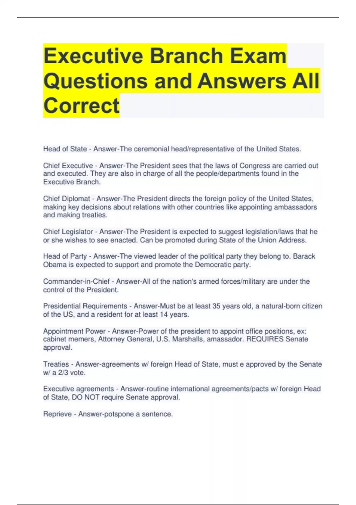 Executive Branch Exam Questions and Answers All Correct Head of State - Answer-The ceremonial head/representative of the United States. Chief Executive - Answer-The President sees that the laws of Congress are carried out and executed. They are also in charge of all the people/departments found in the Executive Branch. Chief Diplomat - Answer-The President directs the foreign policy of the United States, making key decisions about relations with other countries like appointing ambassadors and making treaties. Chief Legislator - Answer-The President is expected to suggest legislation/laws that he or she wishes to see enacted. Can be promoted during State of the Union Address. Head of Party - Answer-The viewed leader of the political party they belong to. Barack Obama is expected to support and promote the Democratic party. Commander-in-Chief - Answer-All of the nation's armed forces/military are under the control of the President. Presidential Requirements - Answer-Must be at least 35 years old, a natural-born citizen of the US, and a resident for at least 14 years. Appointment Power - Answer-Power of the president to appoint office positions, ex: cabinet memers, Attorney General, U.S. Marshalls, amassador. REQUIRES Senate approval. Treaties - Answer-agreements w/ foreign Head of State, must e approved by the Senate w/ a 2/3 vote. Executive agreements - Answer-routine international agreements/pacts w/ foreign Head of State, DO NOT require Senate approval
