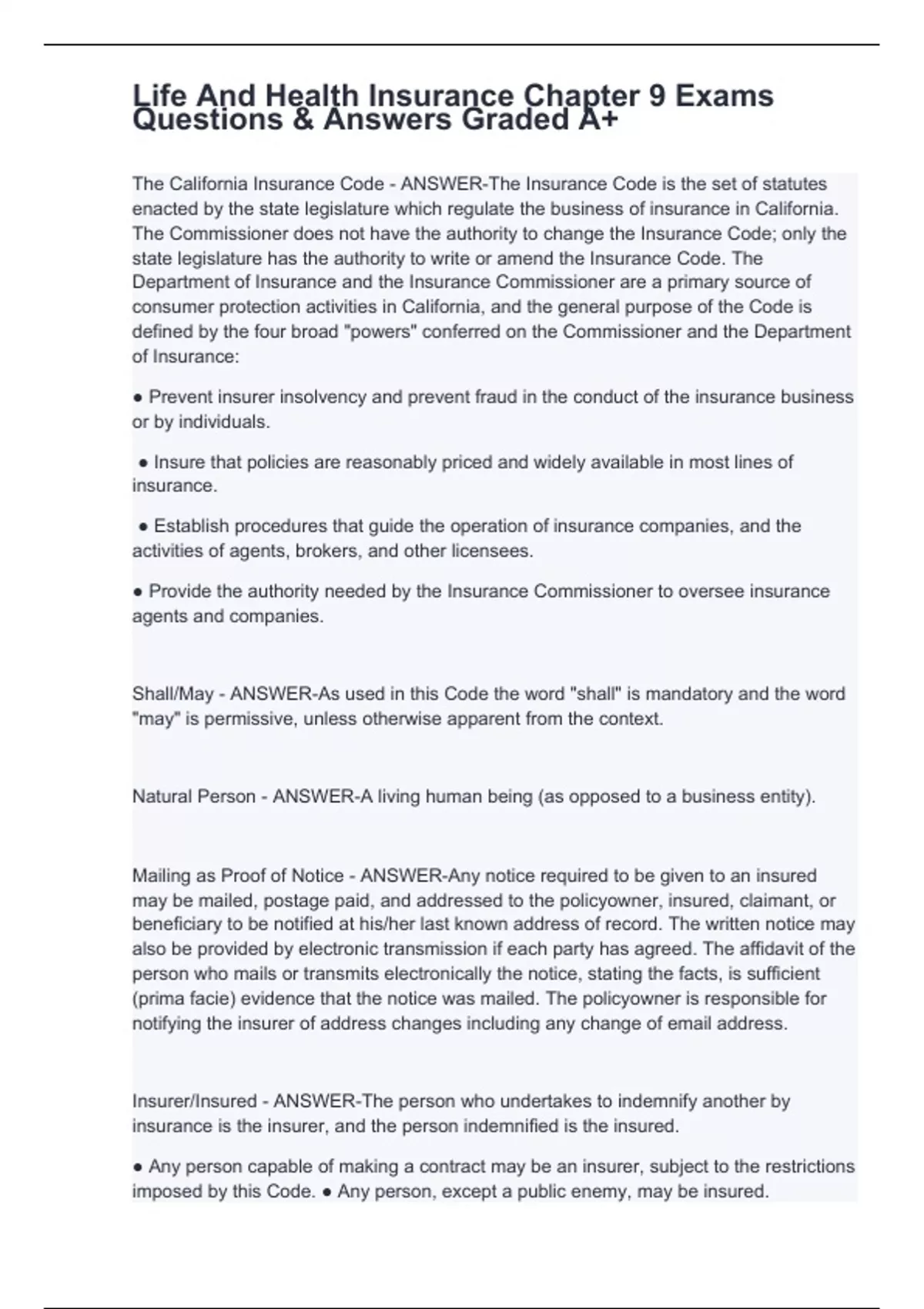 The California Insurance Code - ANSWER-The Insurance Code is the set of statutes enacted by the state legislature which regulate the business of insurance in California. The Commissioner does not have the authority to change the Insurance Code; only the state legislature has the authority to write or amend the Insurance Code. The Department of Insurance and the Insurance Commissioner are a primary source of consumer protection activities in California, and the general purpose of the Code is defined by the four broad "powers" conferred on the Commissioner and the Department of Insurance: ● Prevent insurer insolvency and prevent fraud in the conduct of the insurance business or by individuals. ● Insure that policies are reasonably priced and widely available in most lines of insurance. ● Establish procedures that guide the operation of insurance companies, and the activities of agents, brokers, and other licensees. ● Provide the authority needed by the Insurance Commissioner to oversee insurance agents and companies. Shall/May - ANSWER-As used in this Code the word "shall" is mandatory and the word "may" is permissive, unless otherwise apparent from the context. Natural Person - ANSWER-A living human being (as opposed to a business entity). Mailing as Proof of Notice - ANSWER-Any notice required to be given to an insured may be mailed, postage paid, and addressed to the policyowner, insured, claimant, or beneficiary to be notified at his/her last known address of record. The written notice may also be provided by electronic transmission if each party has agreed. The affidavit of the person who mails or transmits electronically the notice, stating the facts, is sufficient (prima facie) evidence that the notice was mailed. The policyowner is responsible for notifying the insurer of address changes including any change of email address. Insurer/Insured - ANSWER-The person who undertakes to indemnify another by insurance is the insurer, and the person indemnified is the insured. ● Any person capable of making a contract may be an insurer, subject to the restrictions imposed by this Code. ● Any person, except a public enemy, may be insured.
