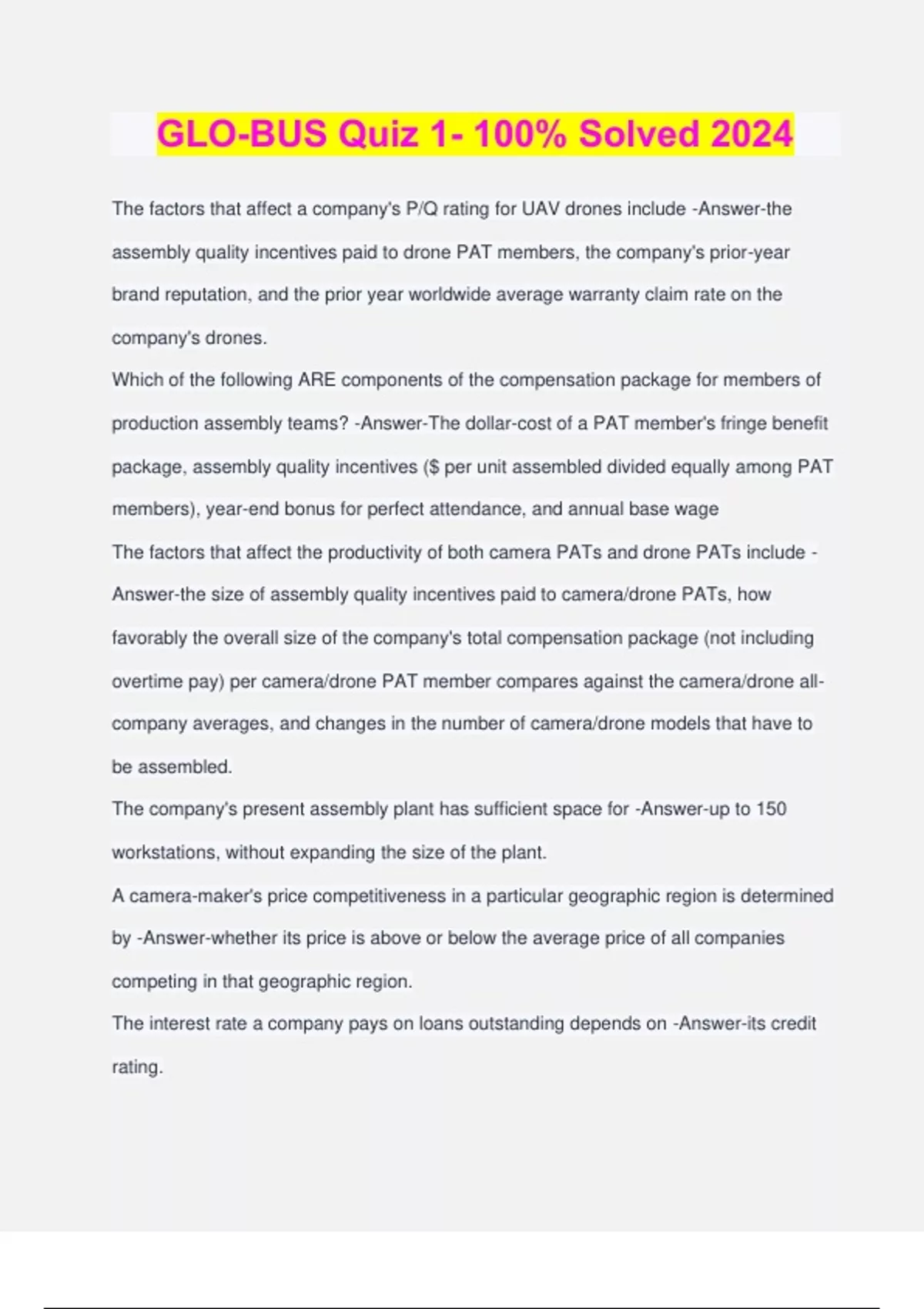 GLO-BUS Quiz 1- 100% Solved 2024 The factors that affect a company's P/Q rating for UAV drones include -Answer-the assembly quality incentives paid to drone PAT members, the company's prior-year brand reputation, and the prior year worldwide average warranty claim rate on the company's drones. Which of the following ARE components of the compensation package for members of production assembly teams? -Answer-The dollar-cost of a PAT member's fringe benefit package, assembly quality incentives ($ per unit assembled divided equally among PAT members), year-end bonus for perfect attendance, and annual base wage The factors that affect the productivity of both camera PATs and drone PATs include - Answer-the size of assembly quality incentives paid to camera/drone PATs, how favorably the overall size of the company's total compensation package (not including overtime pay) per camera/drone PAT member compares against the camera/drone all- company averages, and changes in the number of camera/drone models that have to be assembled. The company's present assembly plant has sufficient space for -Answer-up to 150 workstations, without expanding the size of the plant. A camera-maker's price competitiveness in a particular geographic region is determined by -Answer-whether its price is above or below the average price of all companies competing in that geographic region. The interest rate a company pays on loans outstanding depends on -Answer-its credit rating. Which the following are not factors in determining a company's credit rating? -Answer- The size of the company's year-end cash balance, the average of its ROE for the past three years, and how many times the company has been put on credit watch. Consumer purchases of digital cameras are seasonal with -Answer-about 20% of consumer demand coming in quarter 1, 20% in quarter 2, 20% in quarter 3 and 40% in quarter 4. Which of the following are the four geographic regions in which the company is selling its cameras? -Answer-Europe-Africa, Latin America, Asia-Pacific, and North America. Which of the following currencies are involved in affecting the revenues your company receives on camera shipments to retailers in the four geographic regions of the world where it markets cameras? -Answer-U.S. dollars, Taiwan dollars, Singapore dollars, euros, and Brazilian real. Which of the following do not have a bearing in determining a company's unit sales and market share of entry-level or multi-featured cameras in a particular geographic region? -Answer-The size of the incentive bonus paid to PATs, the percentage of cameras that were outsourced, and warranty claims costs. The company's shipments of digital cameras to retailers in various foreign countries are subject to -Answer-import duties imposed by the countries to which the cameras are shipped and the effects of fluctuating exchange rates. The factors that affect a company's P/Q rating include: -Answer-the caliber of core components; company's cumulative spending for new product R&D, engineering and design; the number of models; camera body ergonomics/durability; and the number of special utility features. The company maintains a production facility in -Answer-Taiwan. The decisions that company co-manages make each year are organized around - Answer-marketing, product design, assembly/shipping, compensation and labor force, and finance. The options that a company has for assembling enough cameras to meet peak-quarter order form retailers include -Answer-hiring "temporary" PATs, the use of overtime, and outsourcing assembly to contact assemblers. The factors that affect the productivity of PATs include -Answer-the size of incentive bonuses to workers, base pay increases, perfect attendance bonuses, the size of the fringe benefits package, how favorably the overall size of a company's compensation package compares with the industry-average compensation package, expenditures for PAT training and productivity improvement, and changes in the number of models. The market for digital cameras is projected to grow -Answer-at 8-10% annually during the year 6-year 10 period and at 4-6% during the year 11-year 15 period. Which of the following is not an accurate description of the market for digital cameras? - Answer-Retailers get their cameras from camera-makers on a just-in-time delivery basis. Which of the following are not measures on which a company's performance is judged/scored? -Answer-P/Q rating, dividend paymen