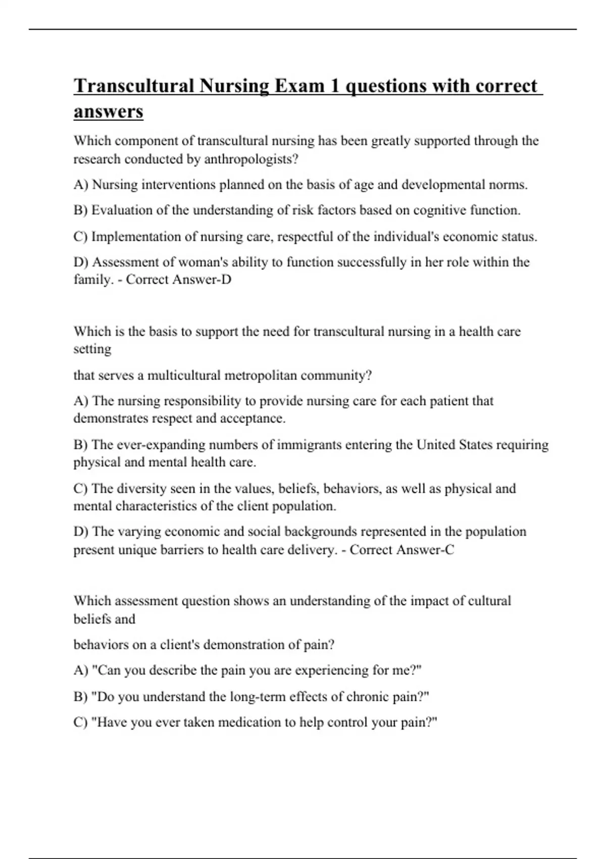 Which component of transcultural nursing has been greatly supported through the research conducted by anthropologists? A) Nursing interventions planned on the basis of age and developmental norms. B) Evaluation of the understanding of risk factors based on cognitive function. C) Implementation of nursing care, respectful of the individual's economic status. D) Assessment of woman's ability to function successfully in her role within the family. - Correct Answer-D Which is the basis to support the need for transcultural nursing in a health care setting that serves a multicultural metropolitan community? A) The nursing responsibility to provide nursing care for each patient that demonstrates respect and acceptance. B) The ever-expanding numbers of immigrants entering the United States requiring physical and mental health care. C) The diversity seen in the values, beliefs, behaviors, as well as physical and mental characteristics of the client population. D) The varying economic and social backgrounds represented in the population present unique barriers to health care delivery. - Correct Answer-C Which assessment question shows an und