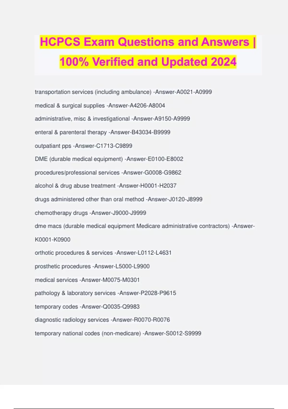 HCPCS Exam Questions and Answers | 100% Verified and Updated 2024 transportation services (including ambulance) -Answer-A0021-A0999 medical & surgical supplies -Answer-A4206-A8004 administrative, misc & investigational -Answer-A9150-A9999 enteral & parenteral therapy -Answer-B43034-B9999 outpatiant pps -Answer-C1713-C9899 DME (durable medical equipment) -Answer-E0100-E8002 procedures/professional services -Answer-G0008-G9862 alcohol & drug abuse treatment -Answer-H0001-H2037 drugs administered other than oral method -Answer-J0120-J8999 chemotherapy drugs -Answer-J9000-J9999 dme macs (durable medical equipment Medicare administrative contractors) -Answer- K0001-K0900 orthotic procedures & services -Answer-L0112-L4631 prosthetic procedures -Answer-L5000-L9900 medical services -Answer-M0075-M0301 pathology & laboratory services -Answer-P2028-P9615 temporary codes -Answer-Q0035-Q9983 diagnostic radiology services -Answer-R0070-R0076 temporary national codes (non-medicare) -Answer-S0012-S9999 national codes established for state Medicaid agencies -Answer-T1000-T5999 vision services -Answer-V2020-V2799 hearing services -Answer-V5008-V5364 A1 -Answer-dressing for 1 wound A2 -Answer-dressing for 2 wounds A3 -Answer-dressing for 3 wounds A4 -Answer-dressing for 4 wounds A5 -Answer-dressing for 5 wounds A6 -Answer-dressing for 6 wounds A7 -Answer-dressing for 7 wounds A8 -Answer-dressing for 8 wounds A9 -Answer-dressing for 9 wounds AA -Answer-anesthesia services performed personally by anesthesiologist AD -Answer-medical supervision by a physician; more than 4 concurrent anesthesia procedures AE -Answer-registered dieticia